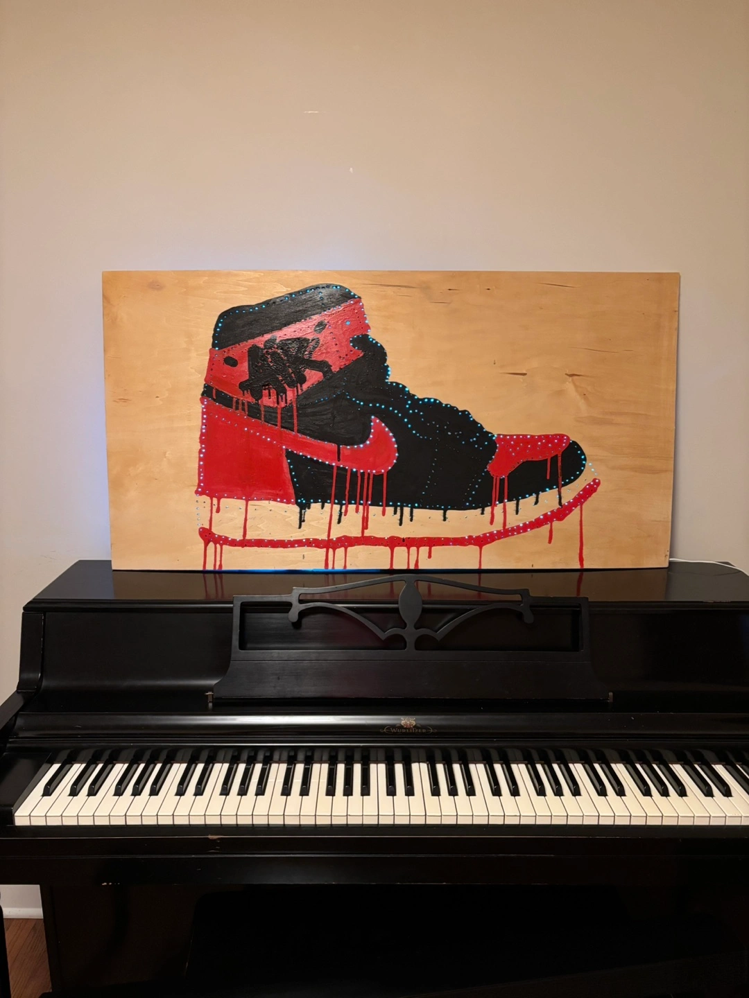 This is a handmade painting of a Nike Air Jordan 1 sneaker. It's a unique piece of art for any sneakerhead or sports fan!