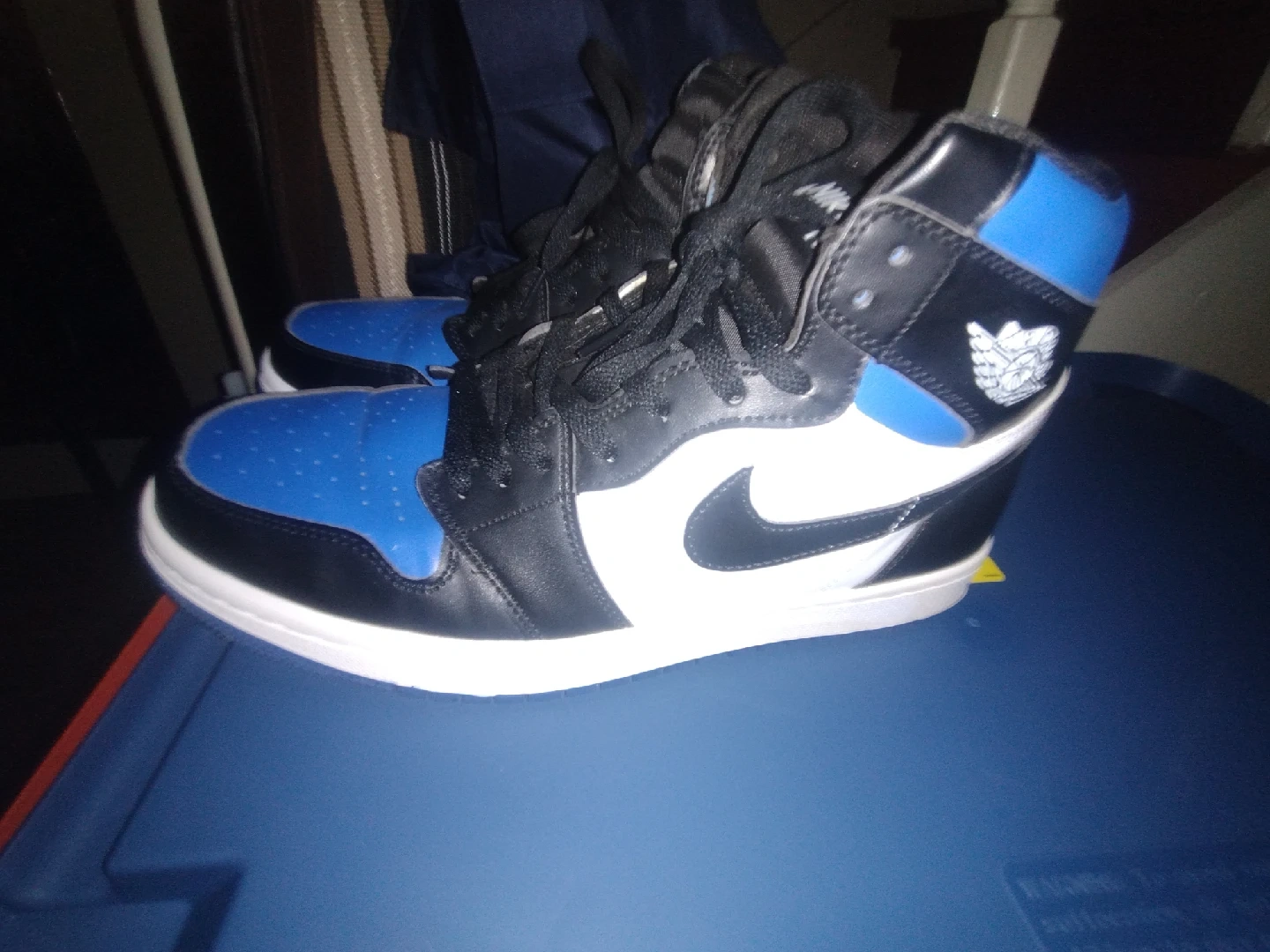 134Selling a pair of Nike Air Jordan 1 Retro High sneakers in a striking blue and black colorway! These high-tops feature the classic Nike Air logo and the iconic Jordan design. They're in great condition and ready for a new home!
