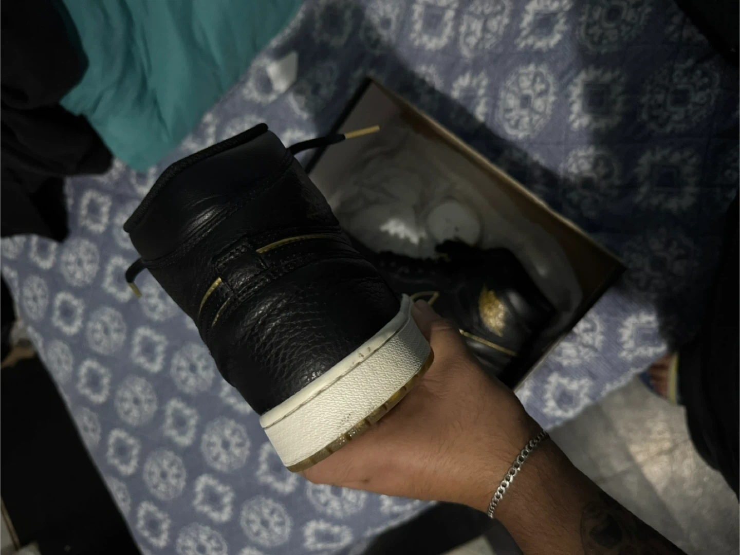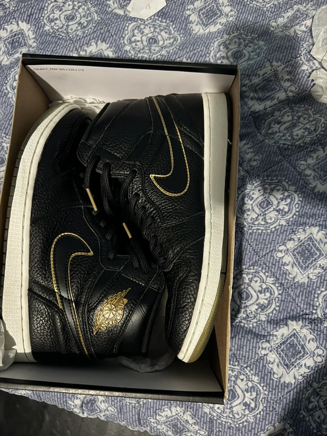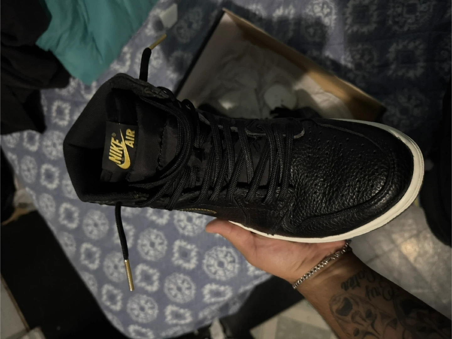 Selling a pair of Nike Air Jordan 1 Retro High OG sneakers in black and gold. These shoes come with the original box. They are in good condition and ready for a new home!