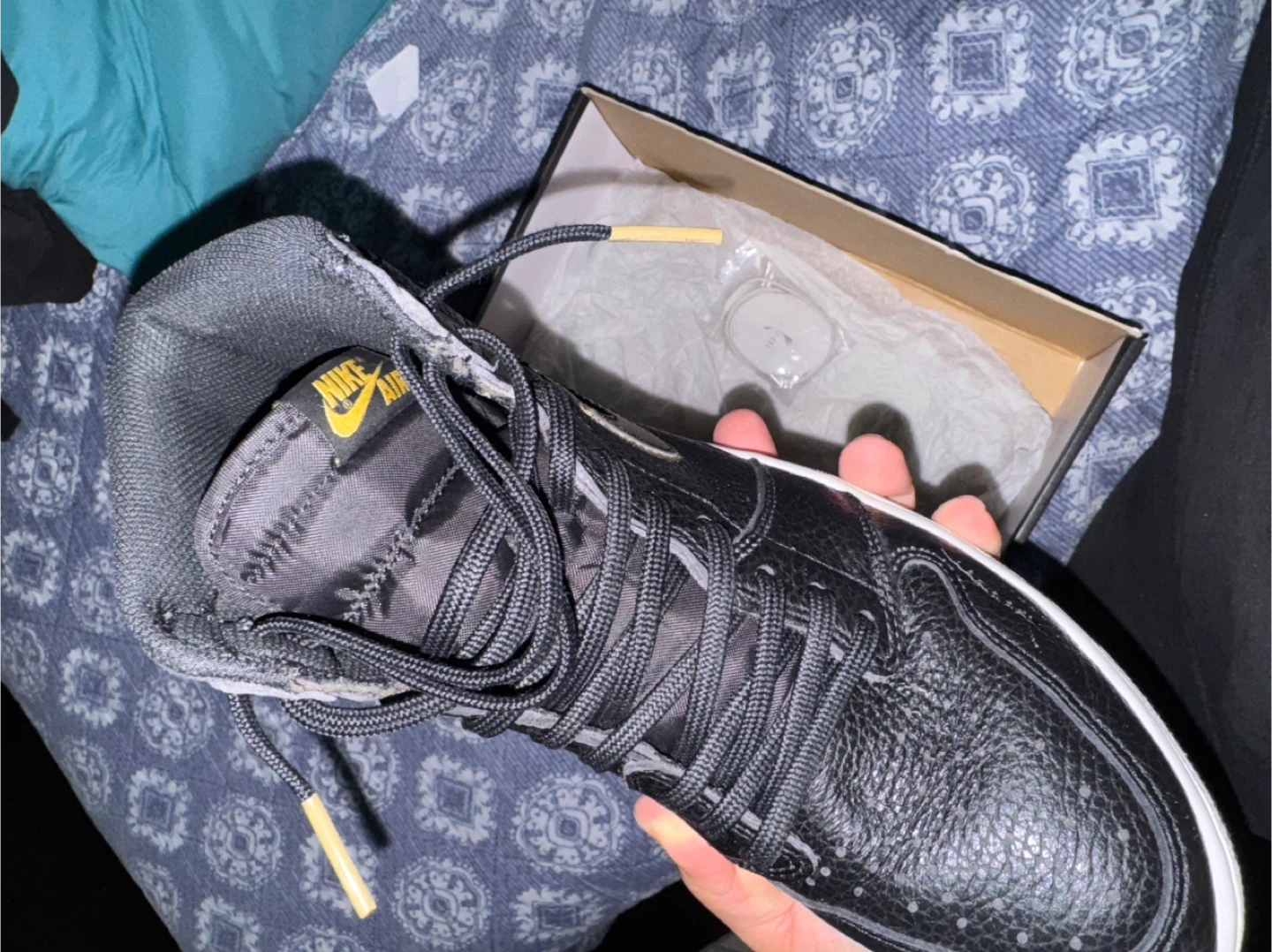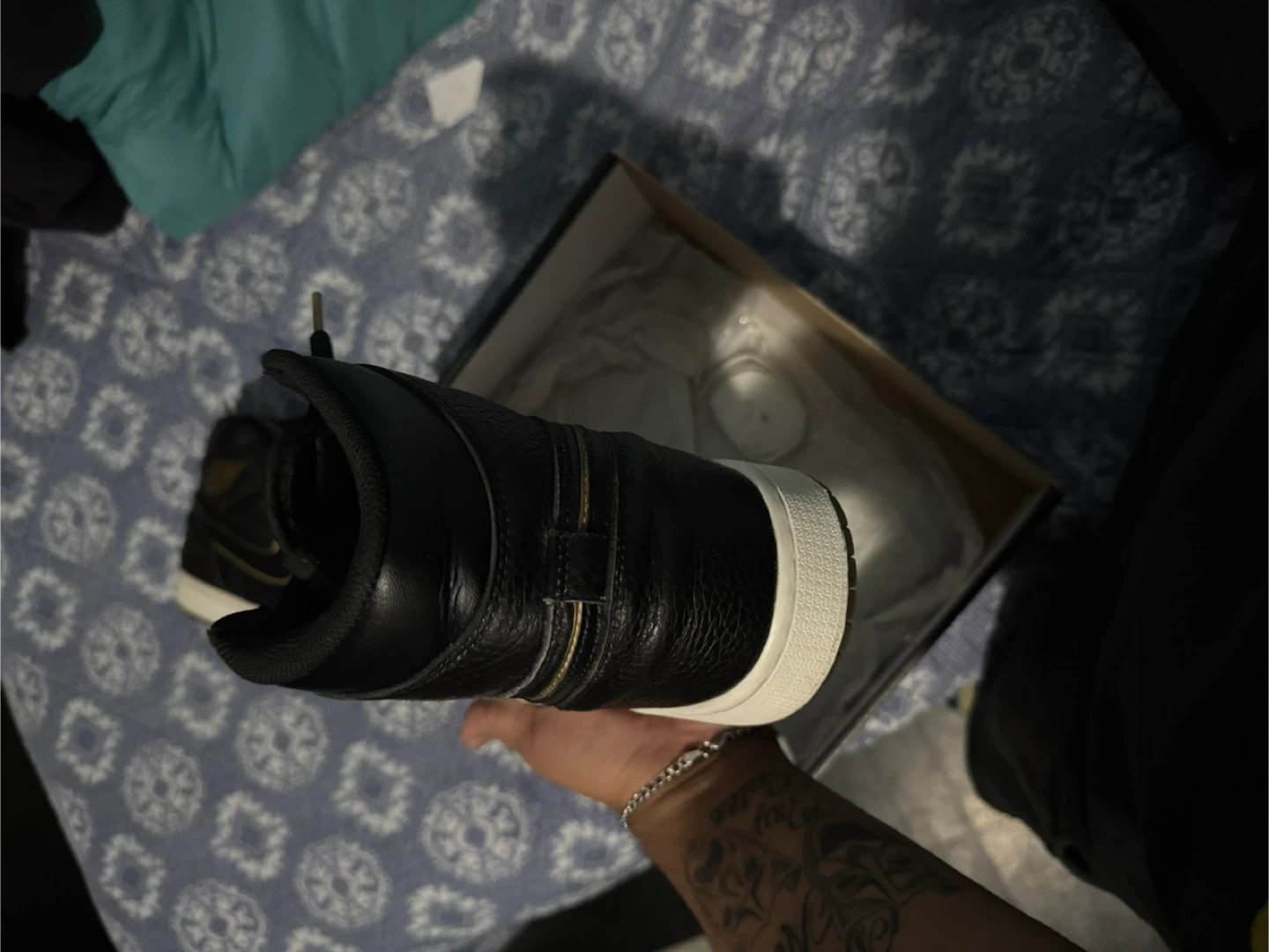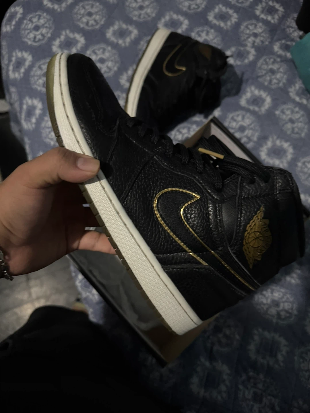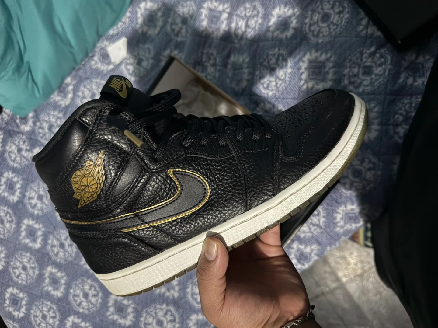 Selling a pair of Nike Air Jordan 1 Retro High OG sneakers in black and gold. These shoes come with the original box. They are in good condition and ready for a new home!
