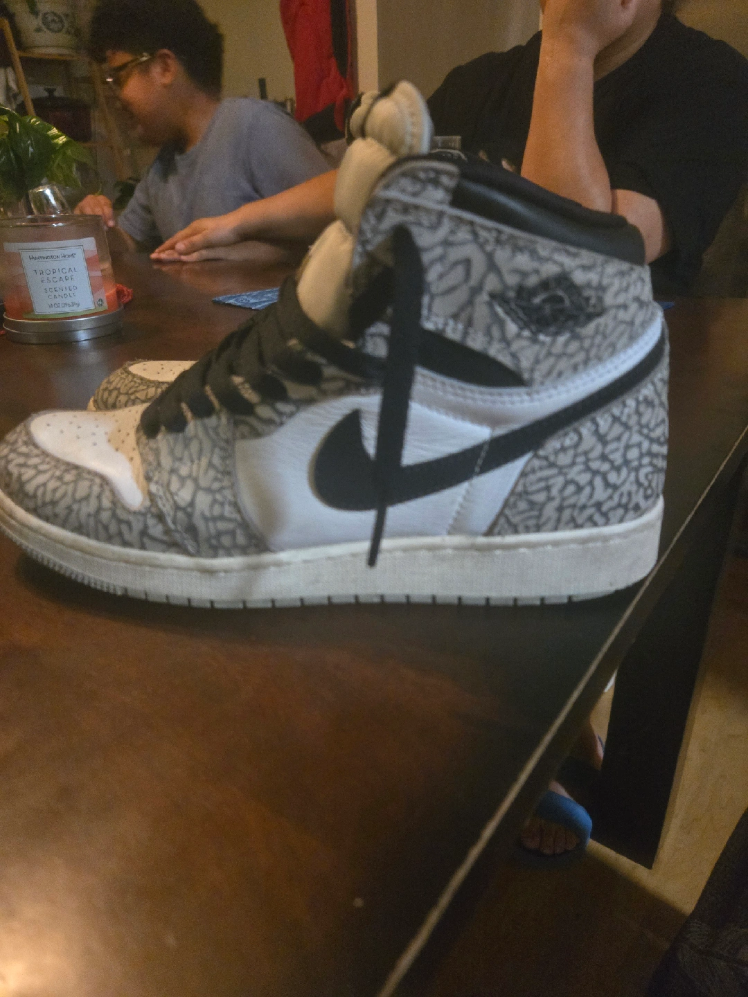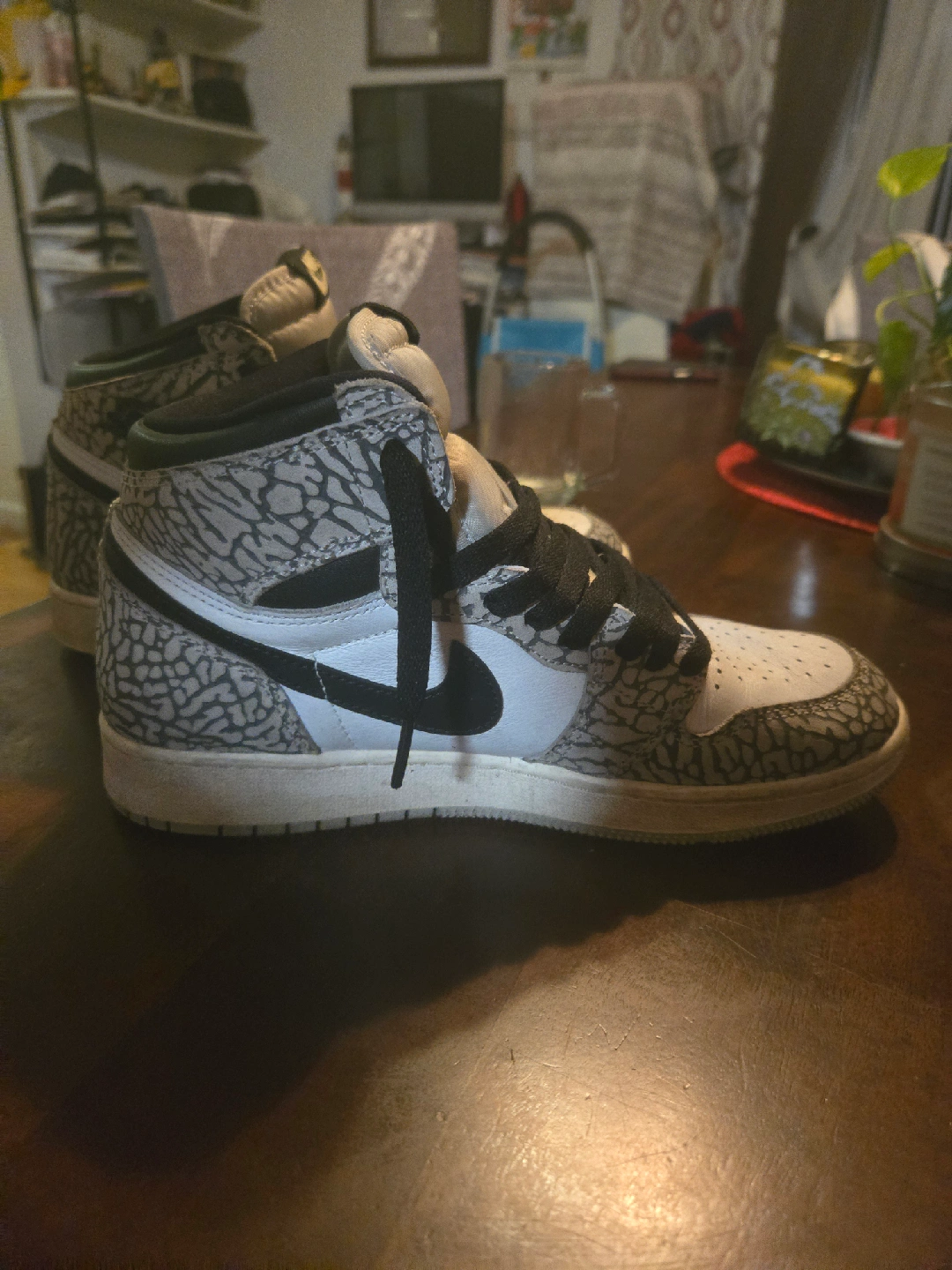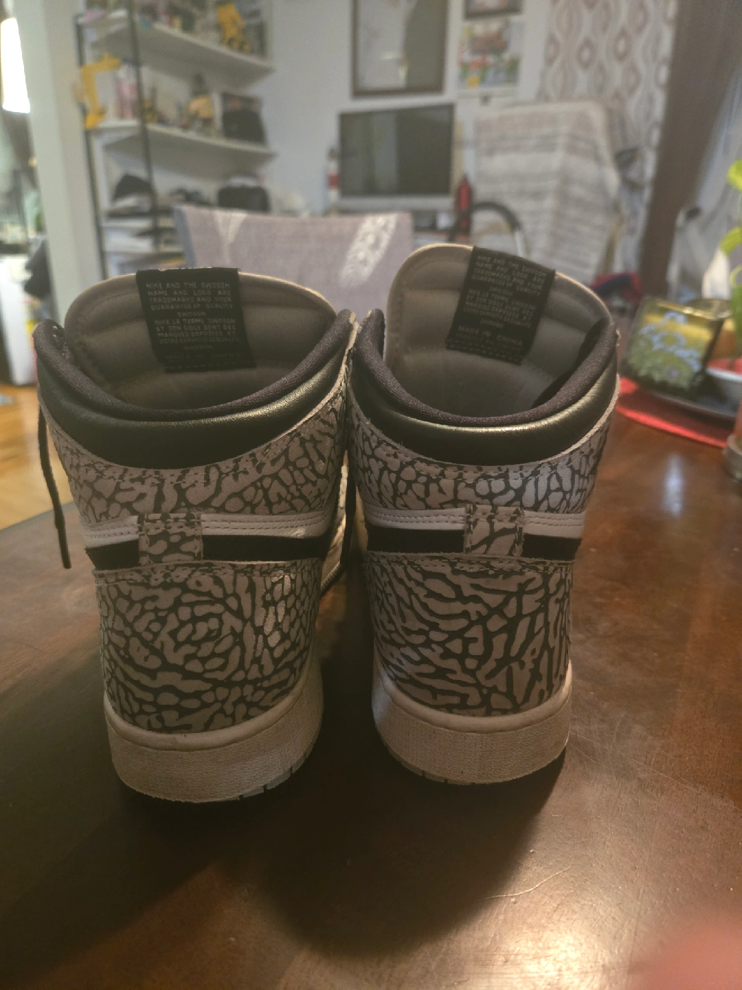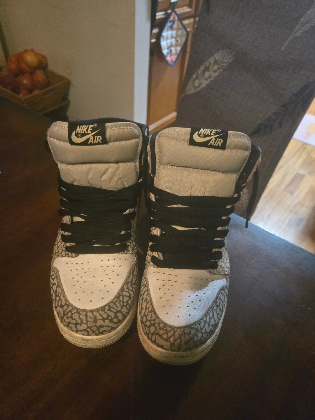 Selling a pair of Nike Air Jordan 1 Retro High sneakers. These are in used condition, as shown in the pictures. They feature the classic Nike Air logo on the tongue. Great for any sneaker enthusiast!