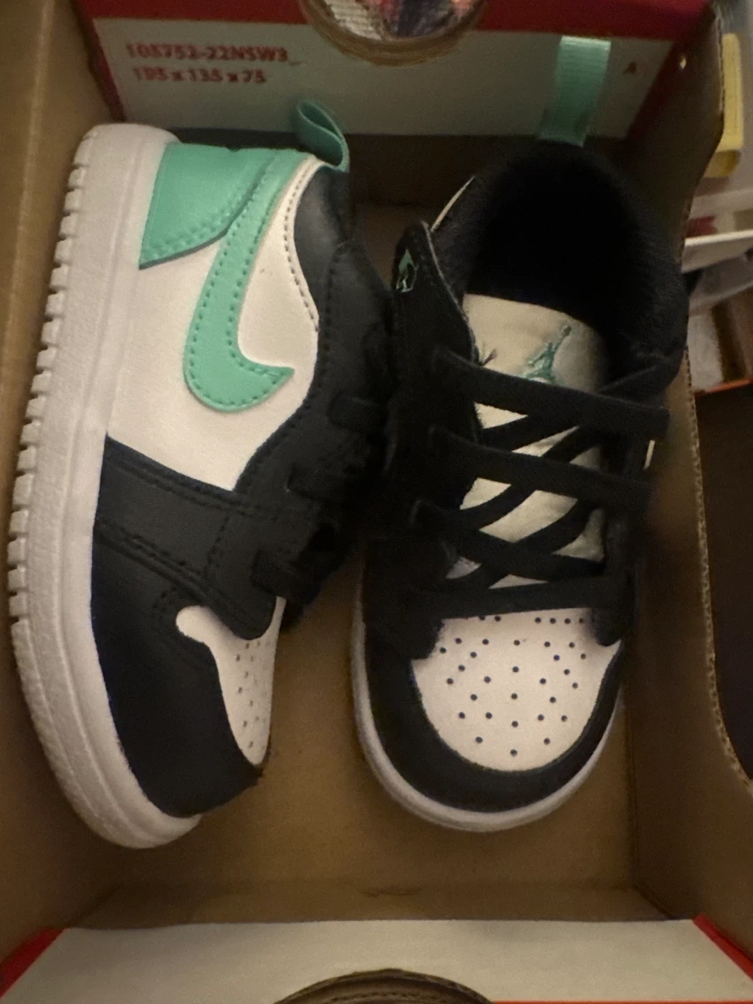 65Here are a pair of toddler sized Air Jordan 1s! They feature a black and white colorway with a light green swoosh. They are in good condition and ready for a new home! Dunk low (TDE) 7c