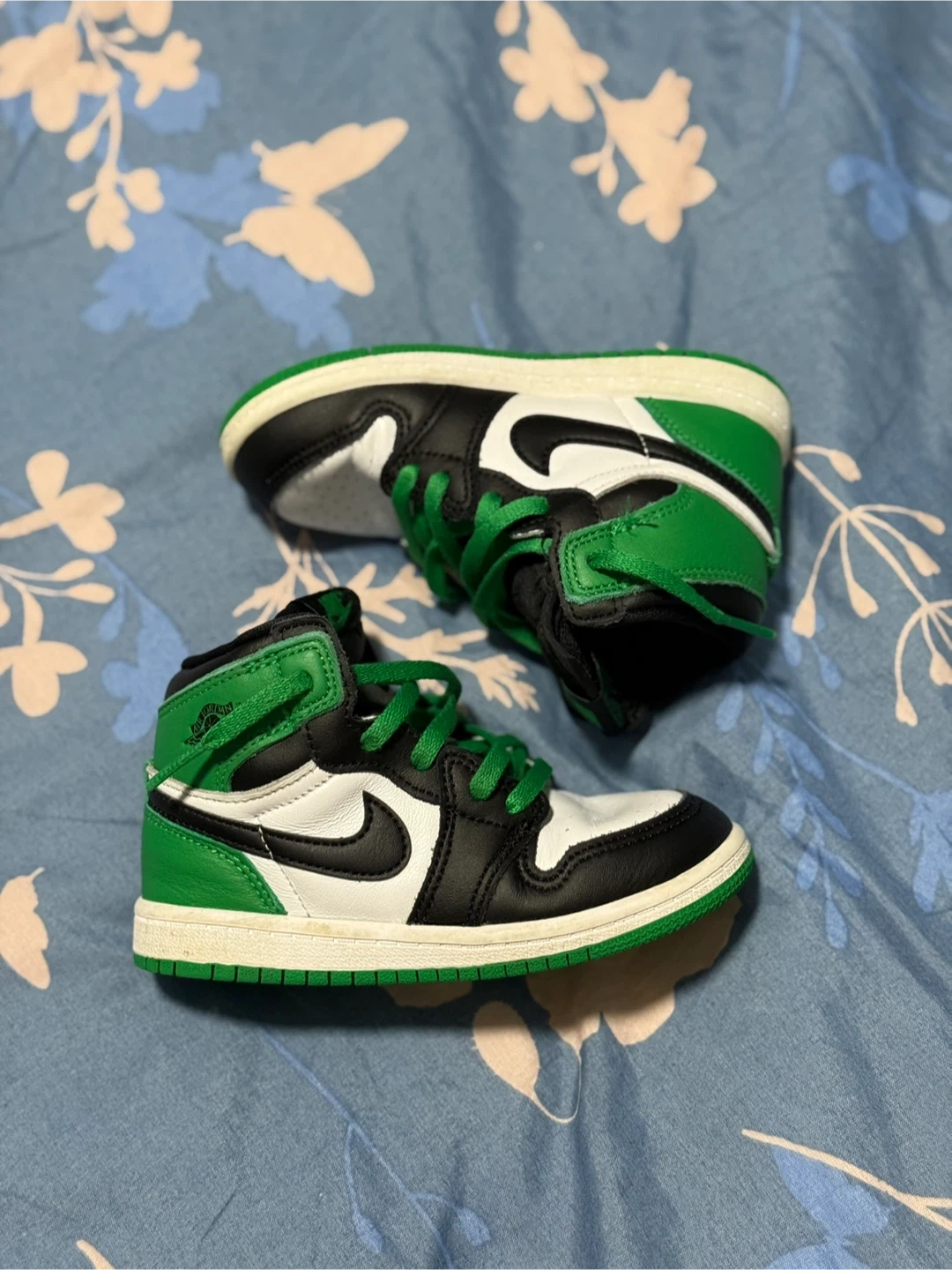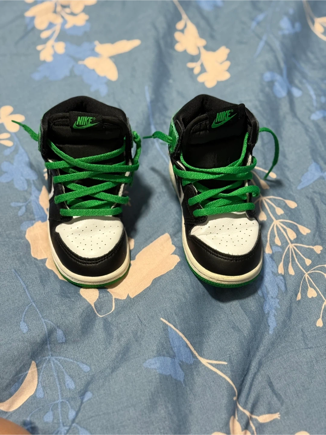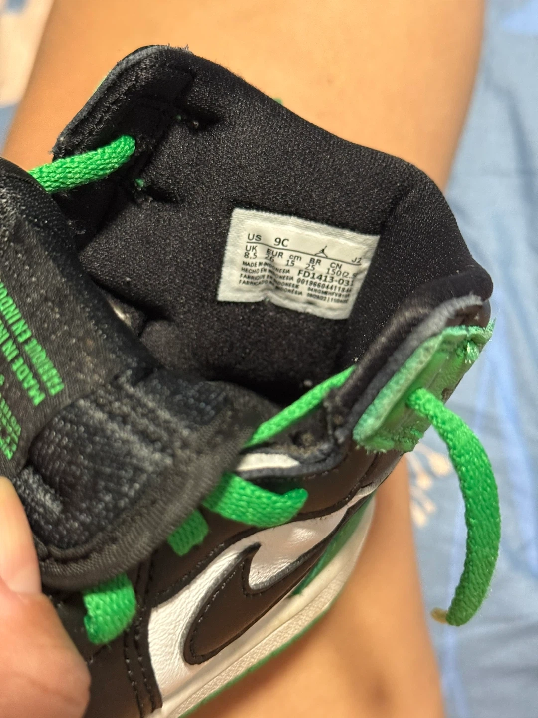 10These are toddler-sized Nike Air Jordan 1s in a cool black, white, and green colorway! They're in great condition and perfect for your little one to step out in style. The size is US 9c as shown on the tag