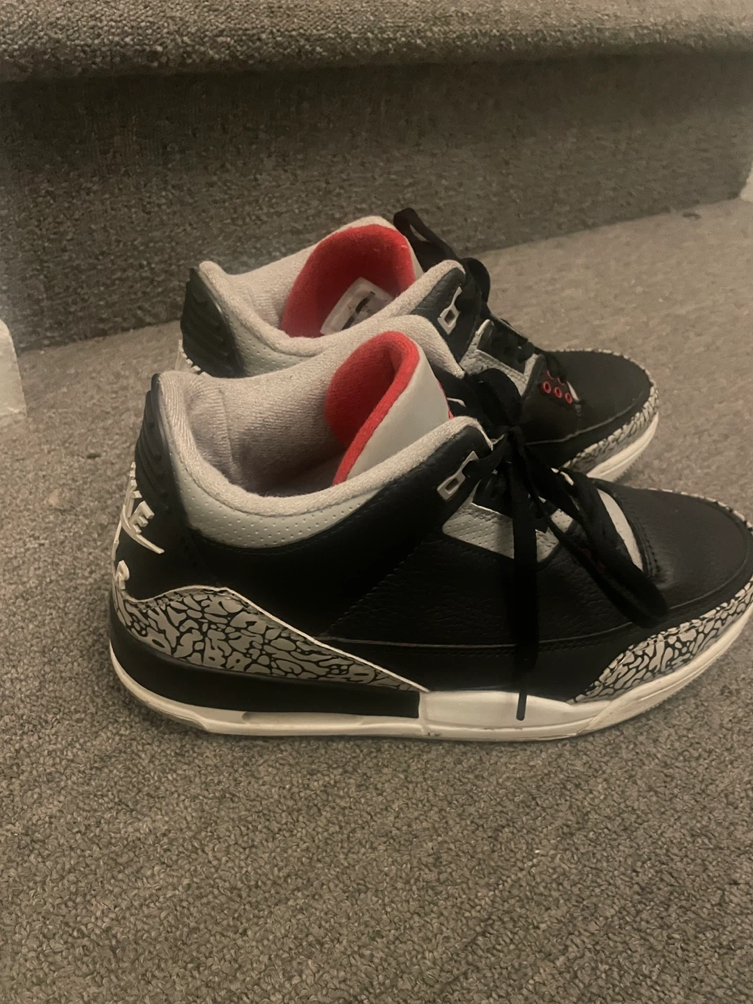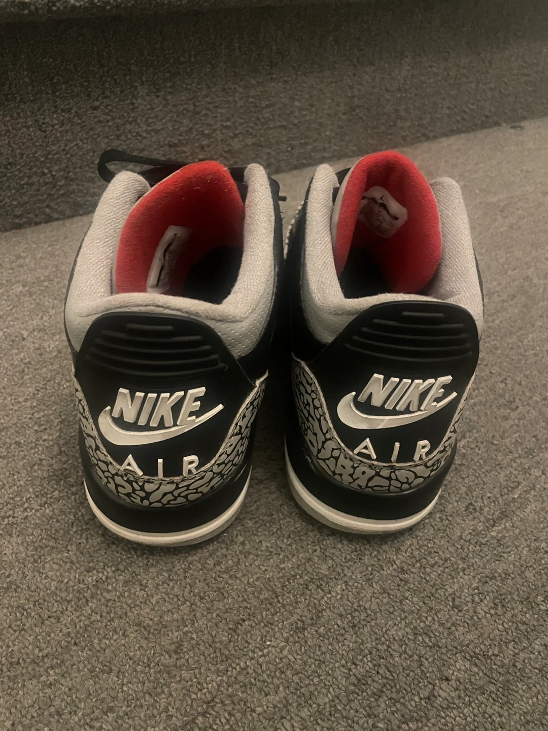 10Selling a pair of Nike Air Jordan 3 Retro sneakers in size US 10. They're black, gray, and red. They’re in a pretty good condition