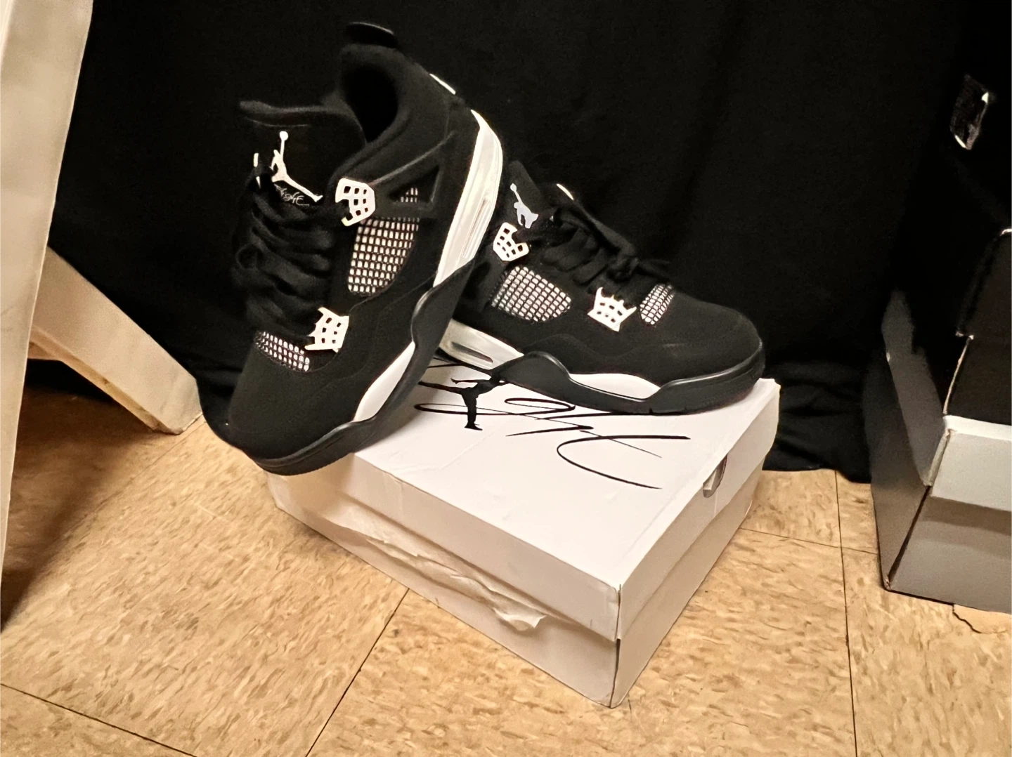 Selling a pair of Nike Air Jordan 4 Retro sneakers in black and white! They come with the original box. These shoes are in great condition and ready for a new home