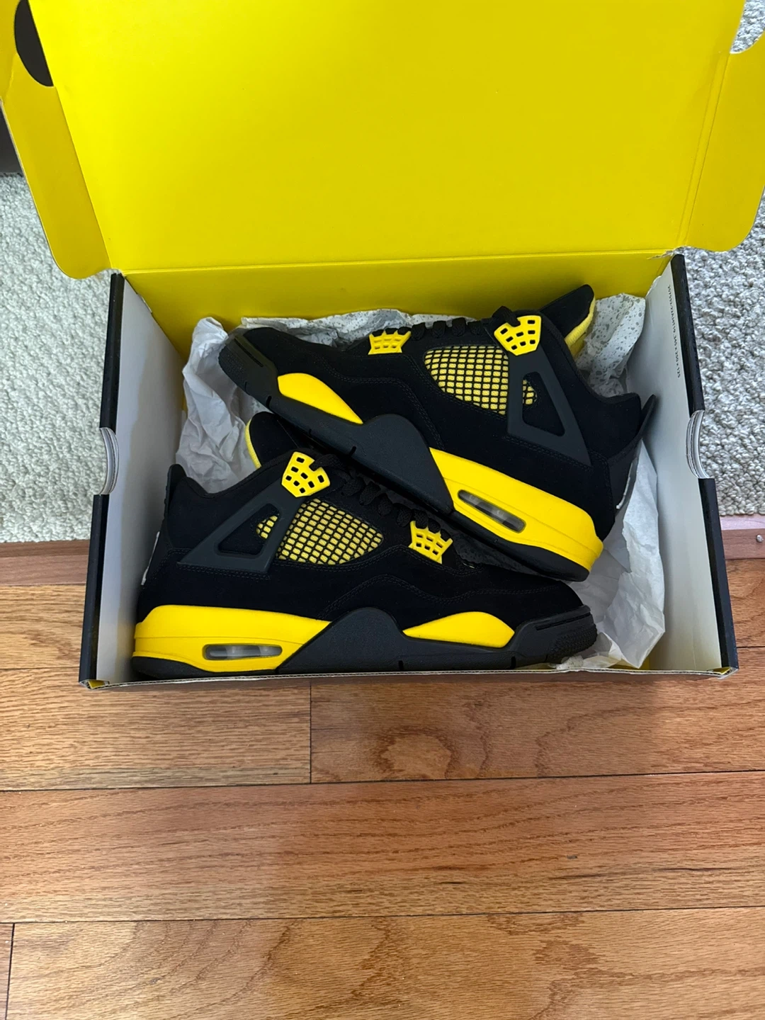 65Selling a pair of Air Jordan 4 Retro Thunder (2023) sneakers! These shoes feature a striking black and yellow colorway. They are in great condition and come with the original box