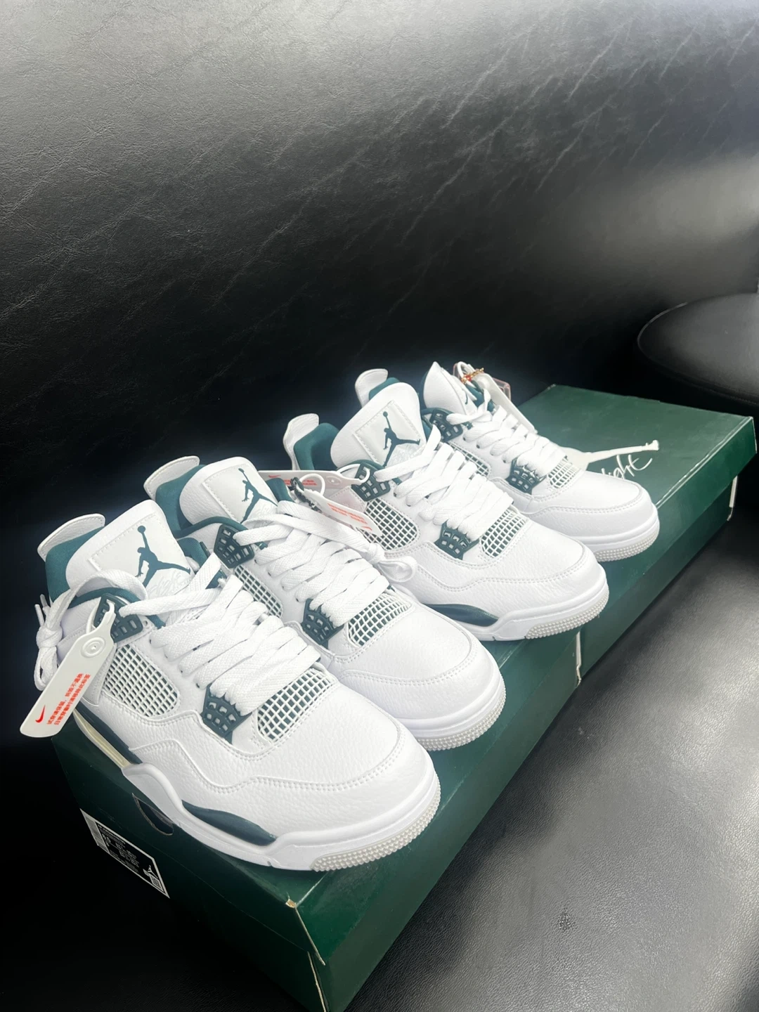Selling a pair of Nike Air Jordan 4 Retro in white and green. They come with the original box. These shoes are in great condition and ready for a new home!