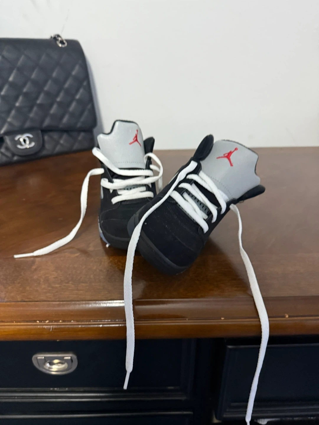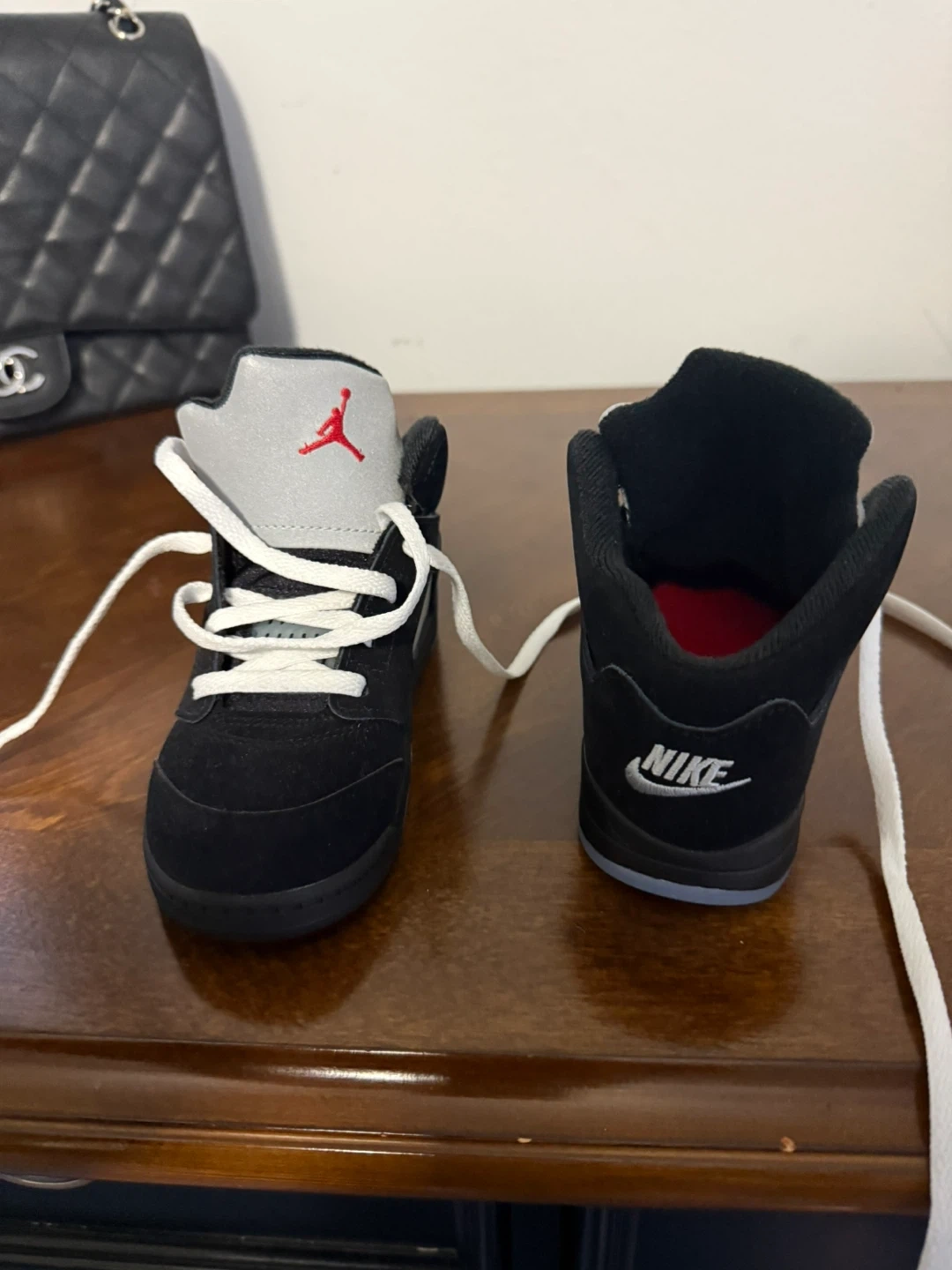 0I'm selling a pair of Nike Air Jordan 5 Retro sneakers. They are black and grey. The size is unknown. They are in good condition.