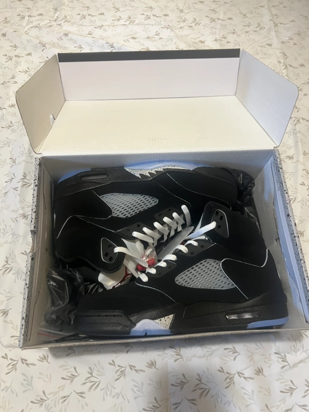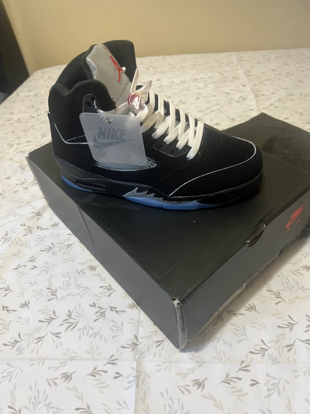 Selling a pair of Nike Air Jordan 5 Retro in black and metallic silver. They are size 9 and come with the original box. Brand New !