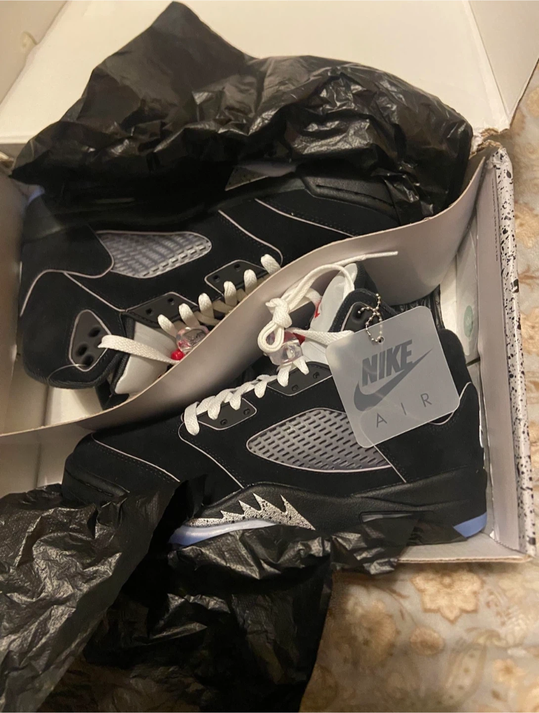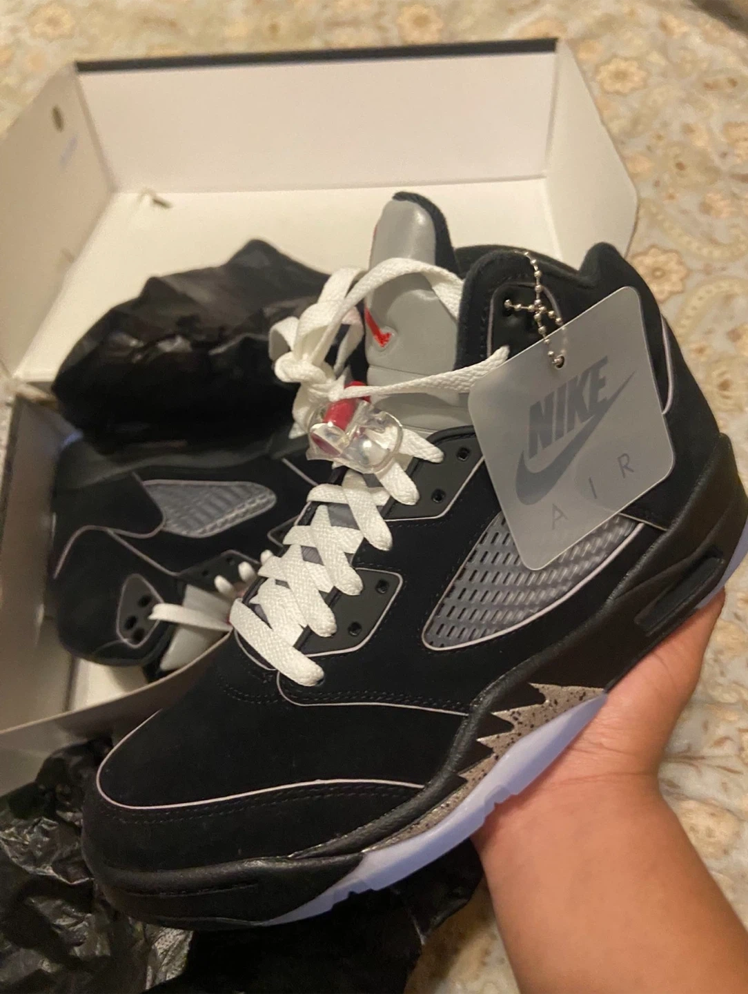 15Selling a pair of Nike Air Jordan 5 Retro in black and silver. These are size 9.5. The shoes come with the original box