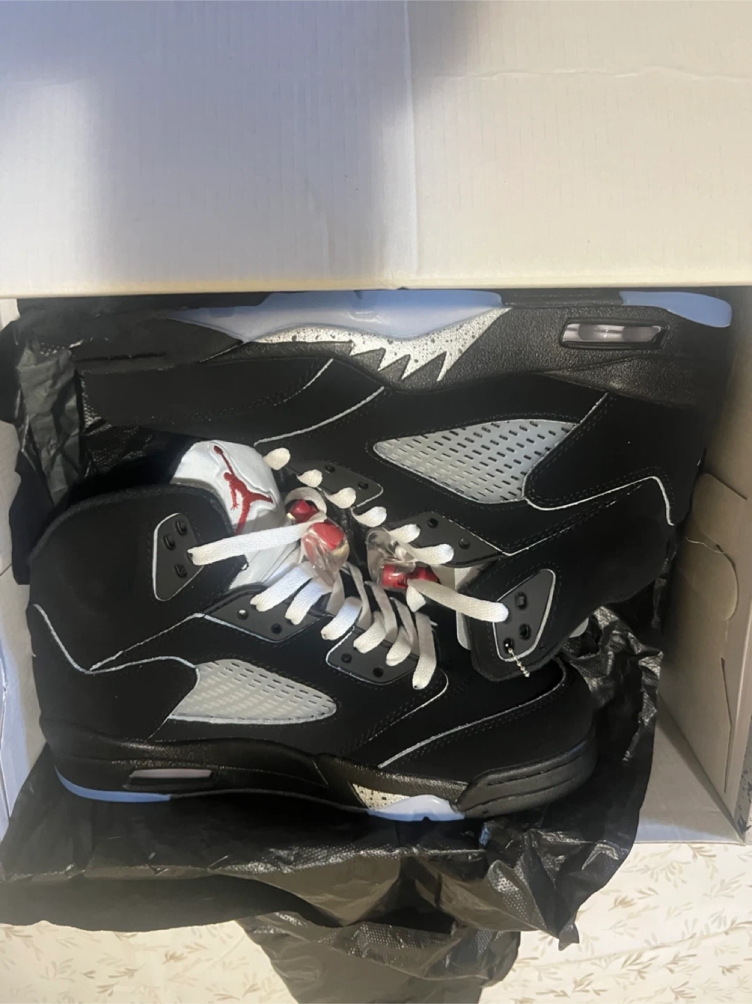 Selling a pair of Nike Air Jordan 5 Retro in black size 10! They come with the original box. These are a stylish and iconic addition to any sneaker collection. Don't miss out!