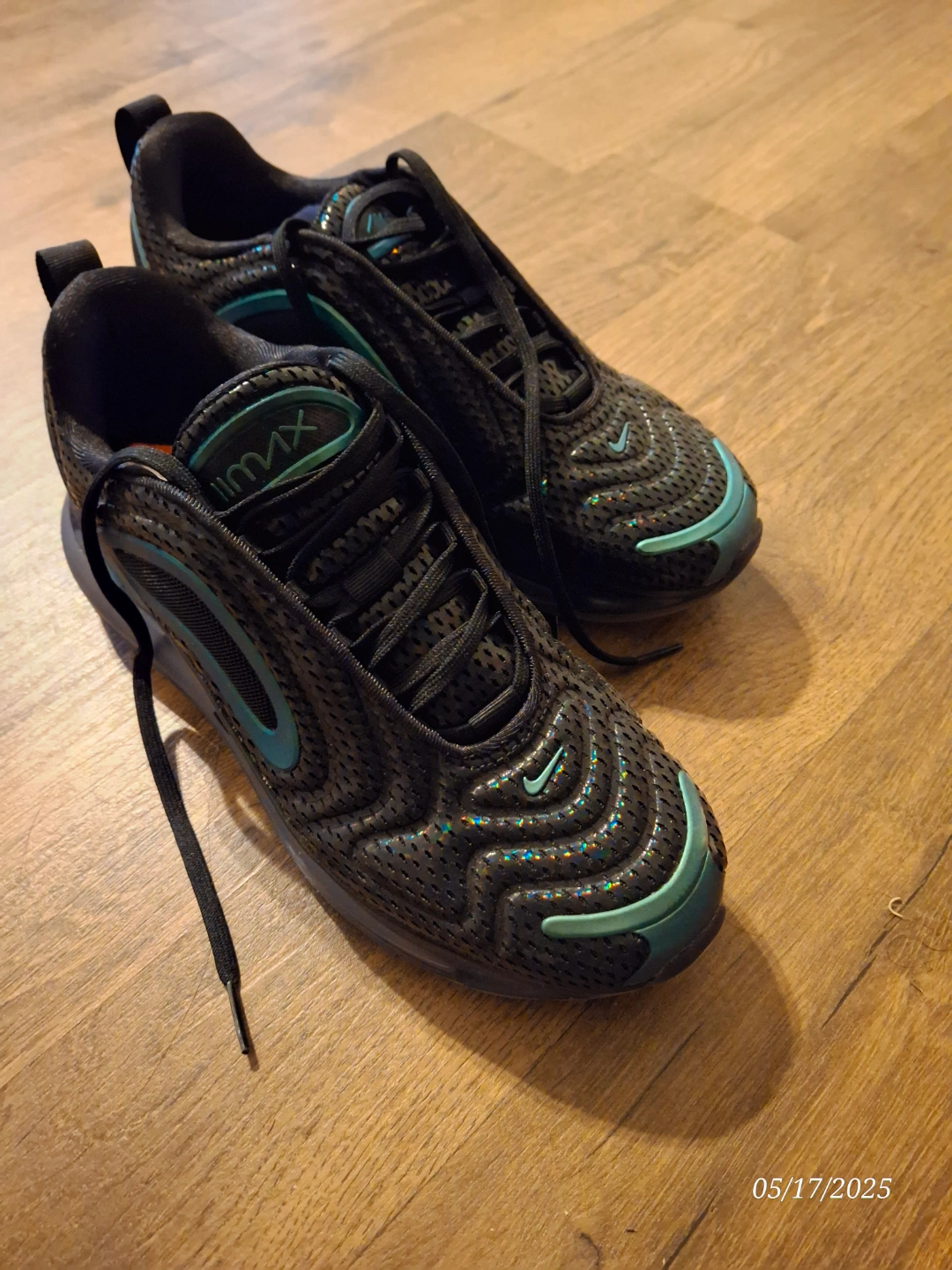 Pair of Nike Air Max 720 running shoes. Black with teal accents. Mesh upper. Good condition.