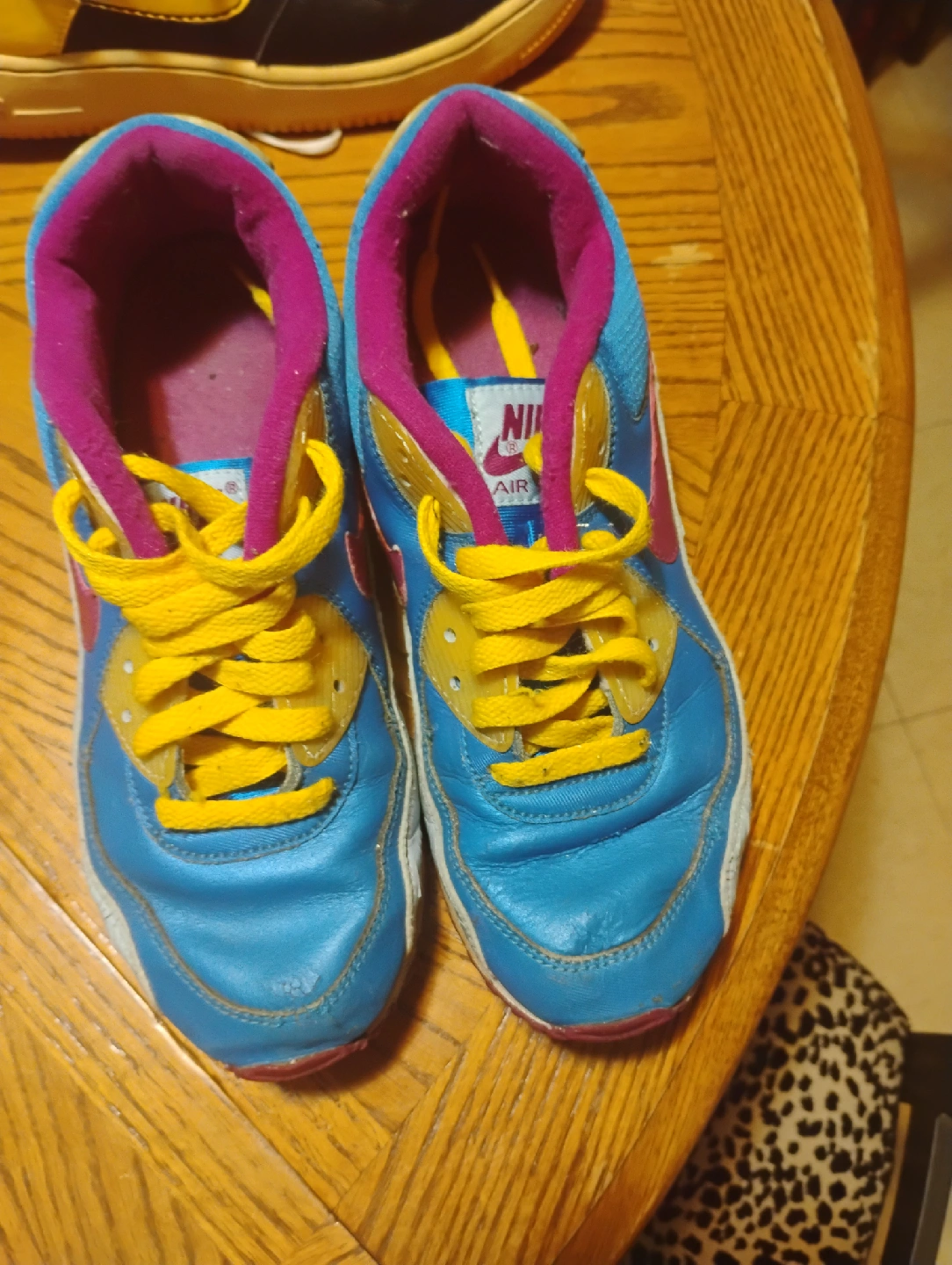 Selling a pair of Nike Air Max 90 sneakers. They feature a cool blue, pink, and yellow color combination. They show signs of wear, but still have plenty of life left!