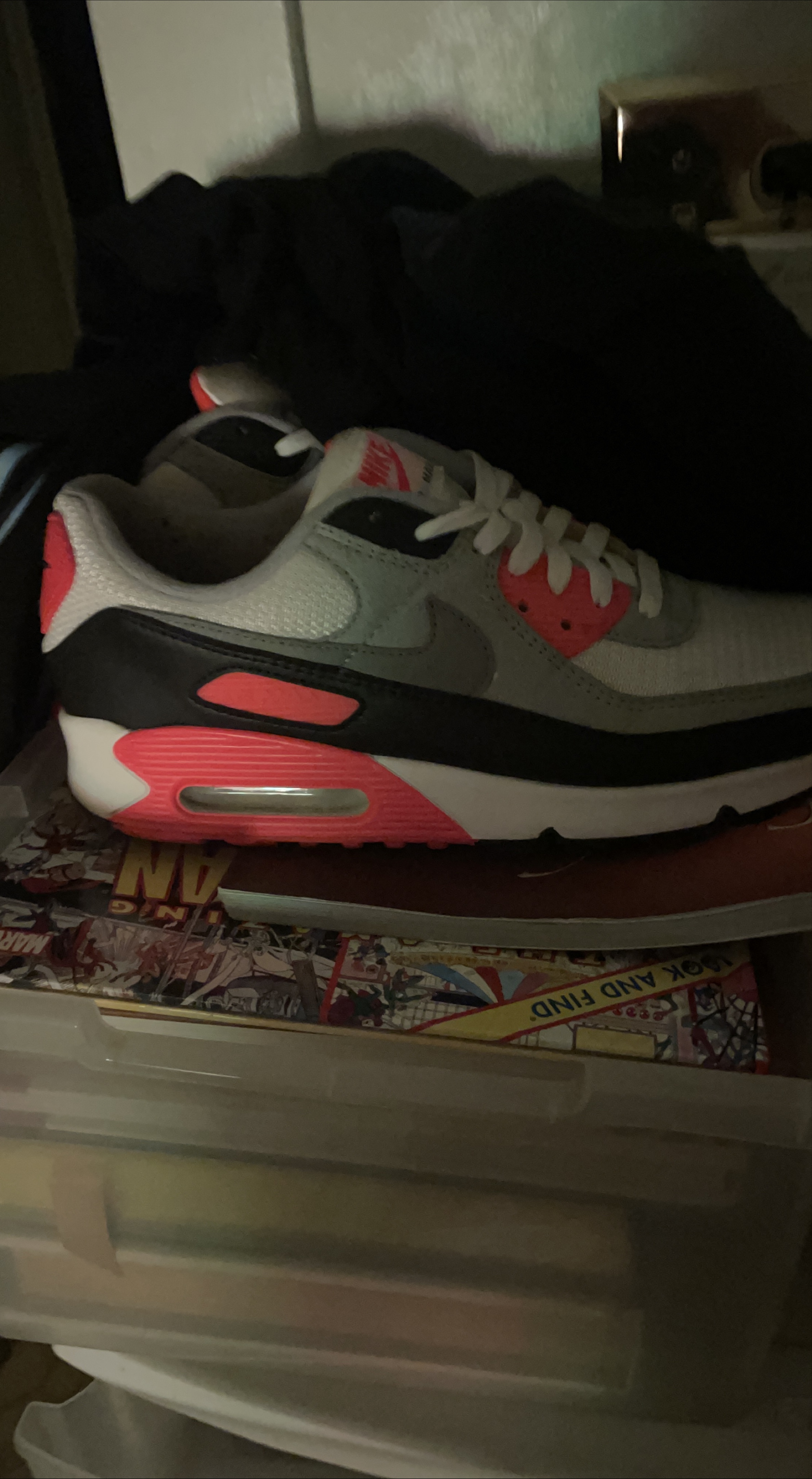 Selling a pair of Nike Air Max 90 sneakers in gray and red. They're in good condition and ready for a new home!