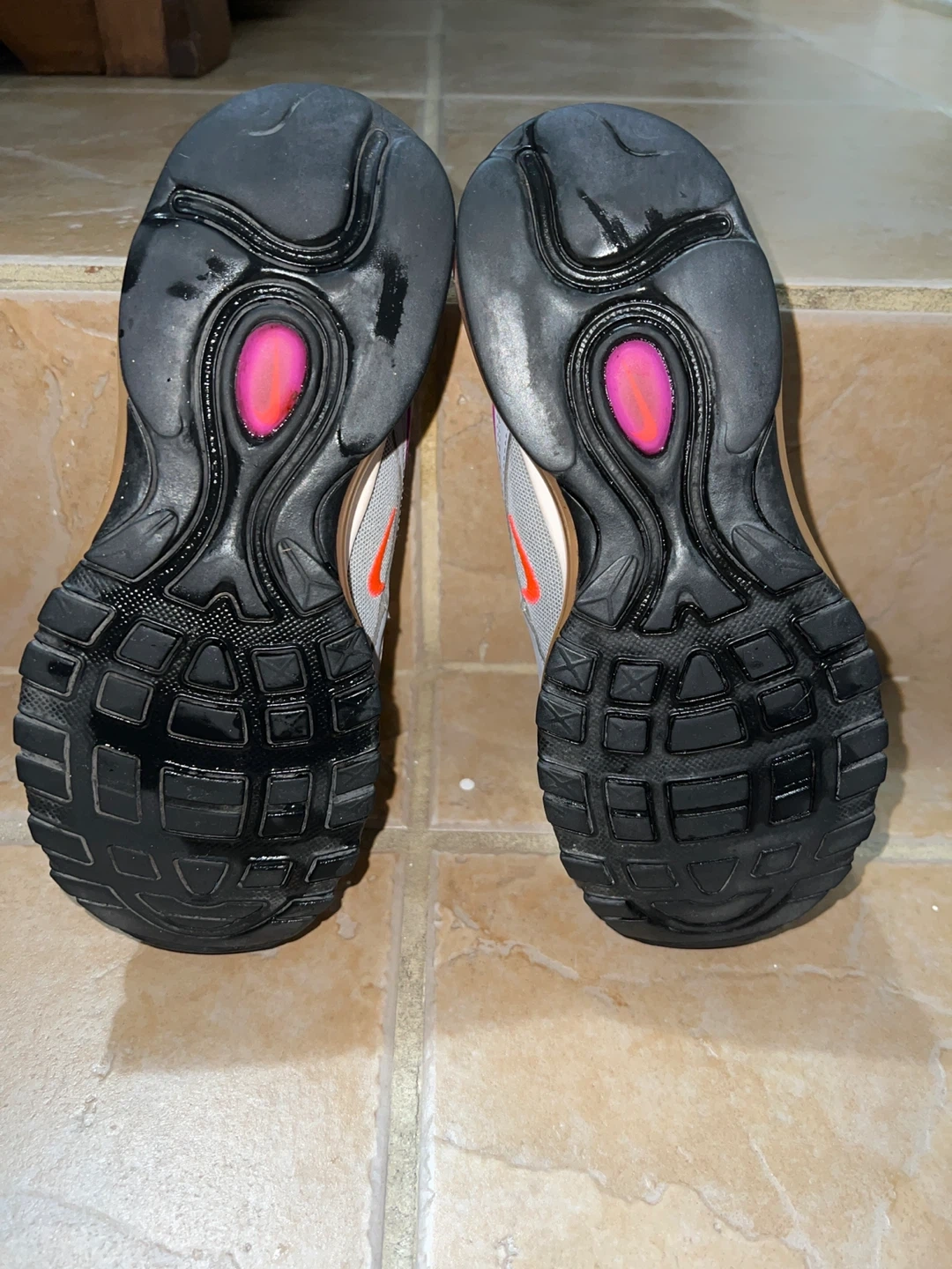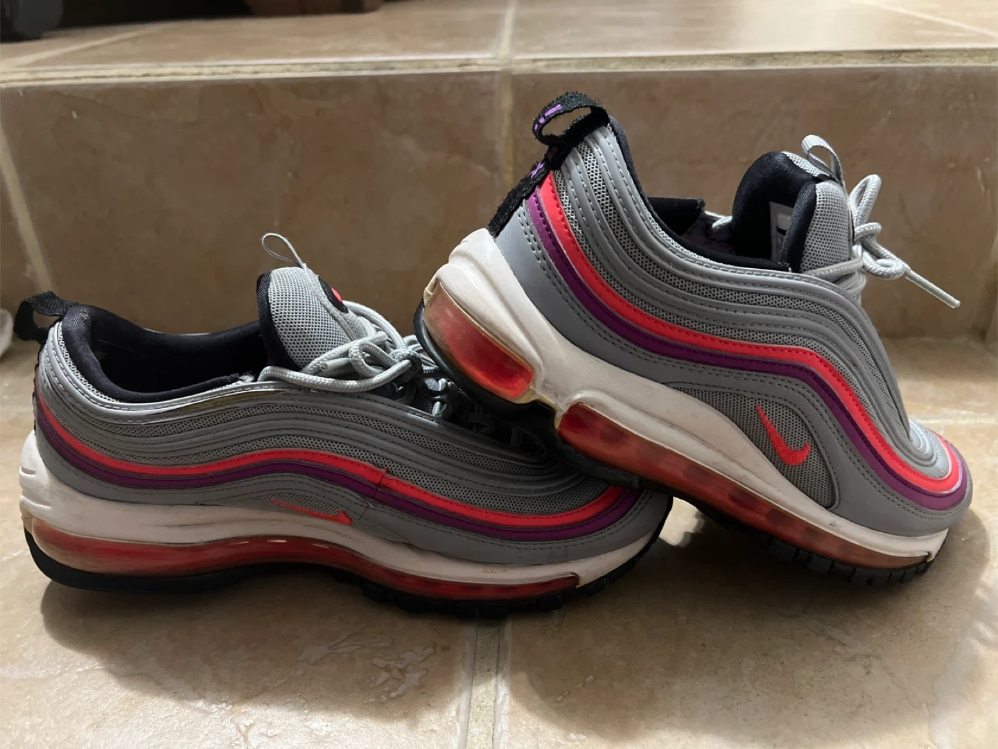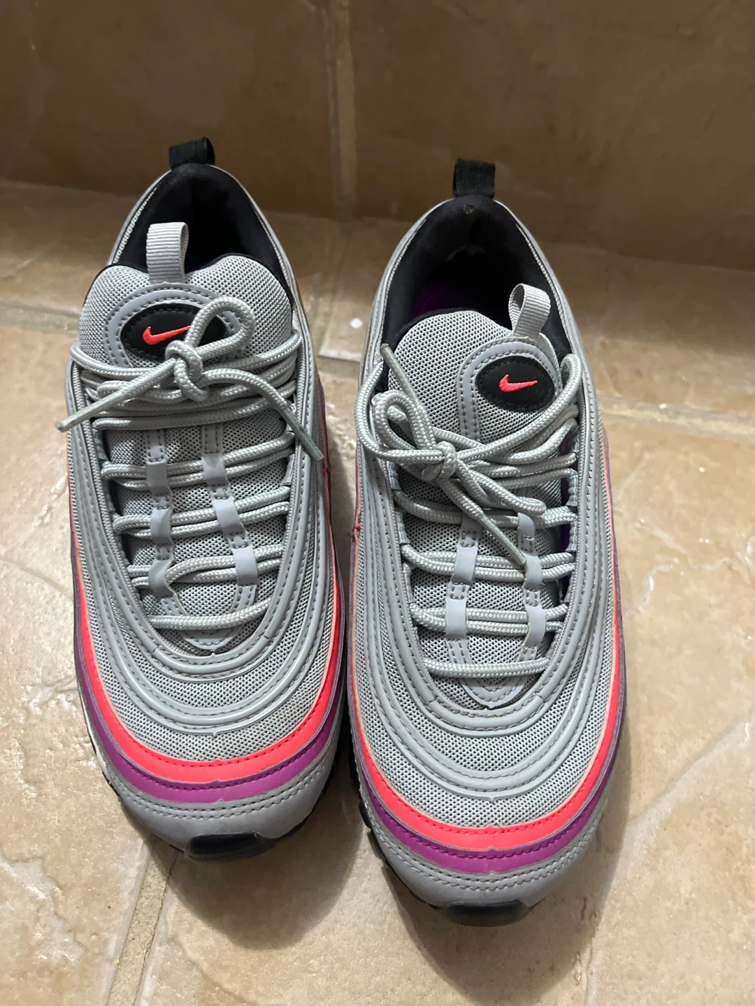 68Selling a pair of Nike Air Max 97 sneakers in gray with purple and pink accents. These are in good condition and ready for a new home! They feature the classic Air Max cushioning for comfort and style.