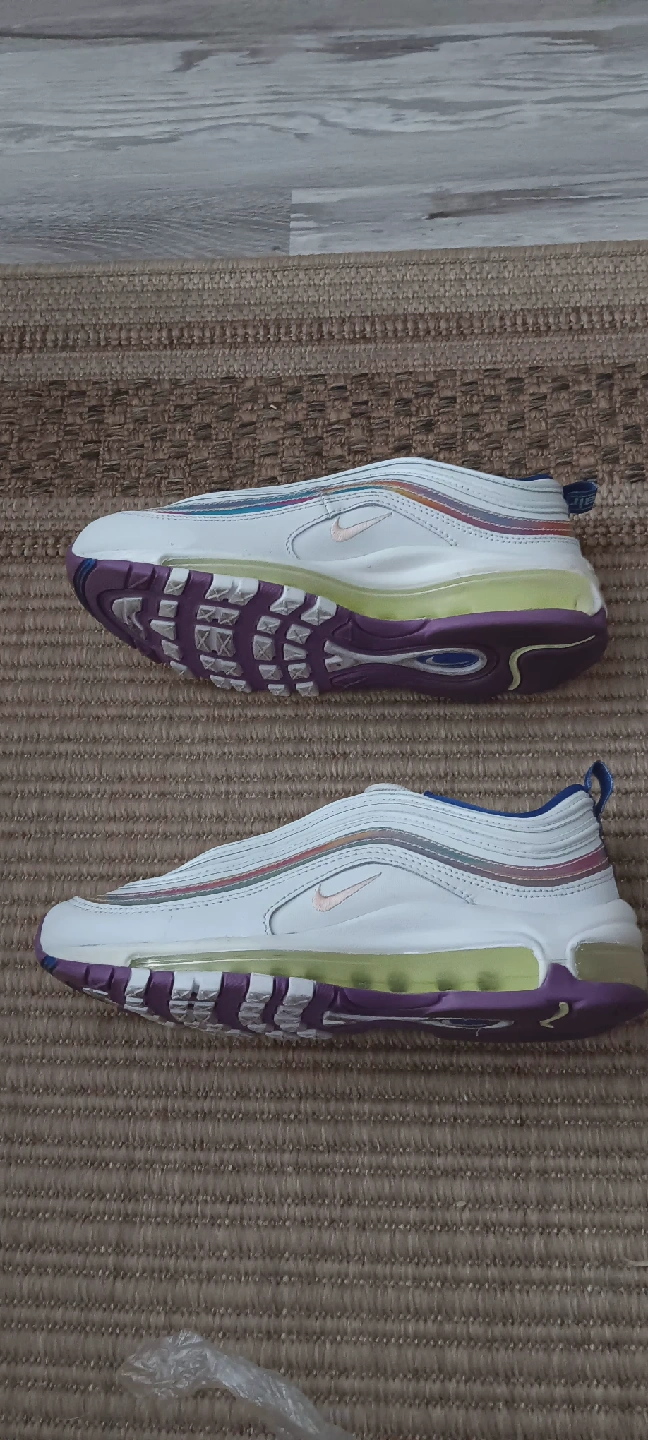 Selling a pair of Nike Air Max 97 sneakers in white and purple! They are in good condition and ready for a new home