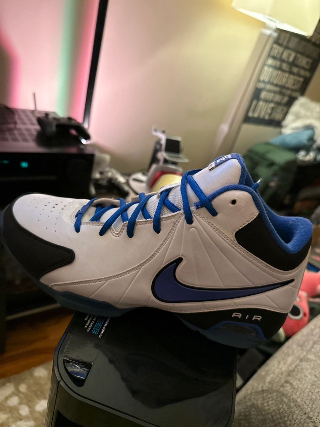 5Men's basketball shoes. White, black, and blue color scheme. Mid-top style. Air Max cushioning. Great for the court.