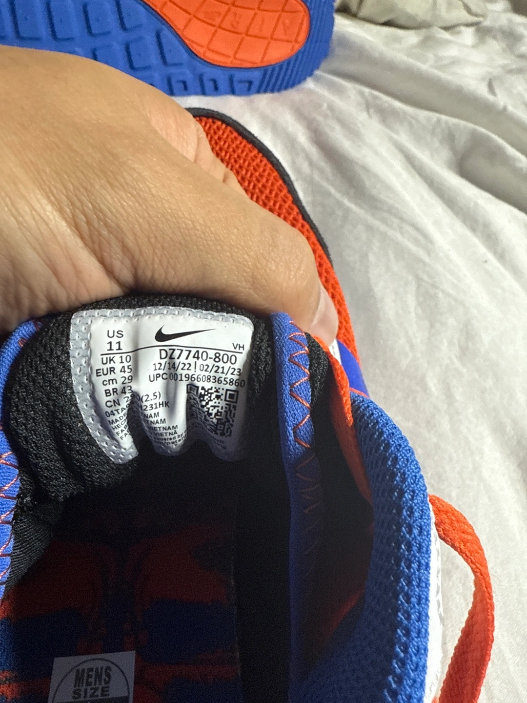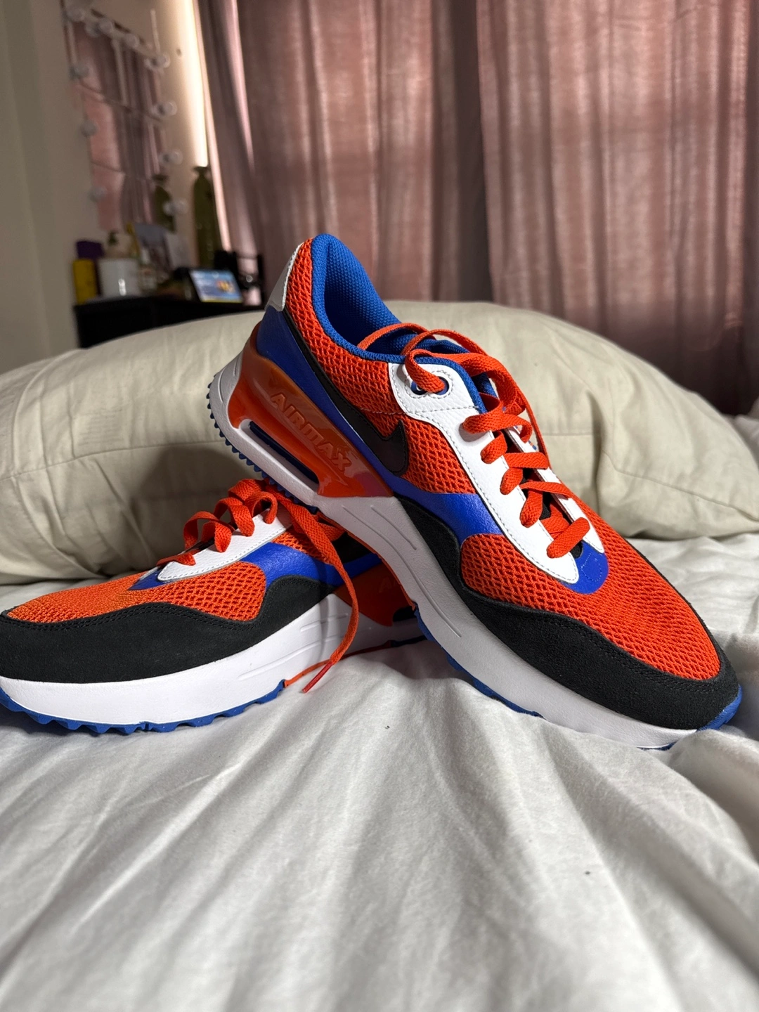 Men's Nike Air Max Goadome sneakers. Size 11. Orange, blue, black, and white color scheme. Mesh upper. Air Max cushioning. Great for everyday wear or light exercise. No box