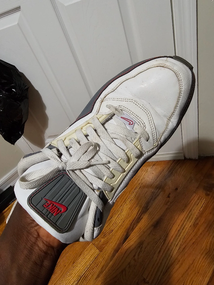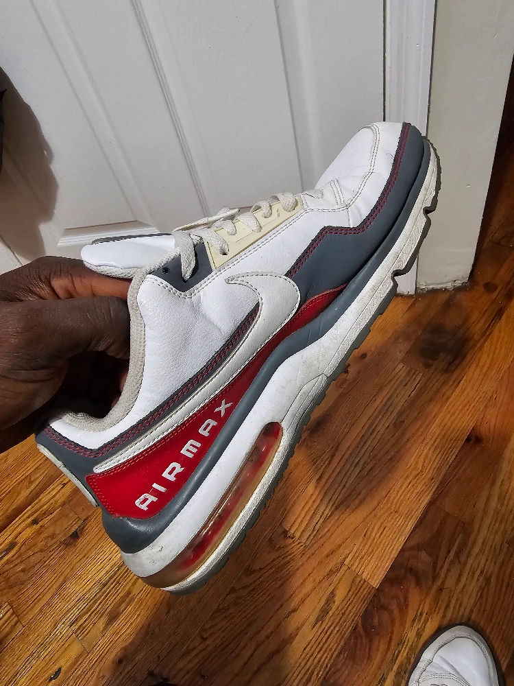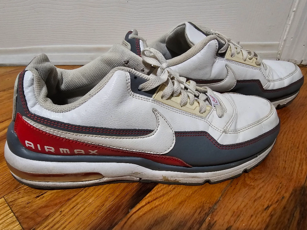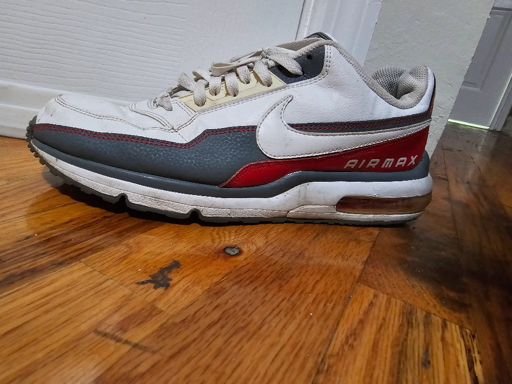 Selling a pair of Nike Air Max LTD sneakers. They are white with red and gray accents and feature the classic Air Max cushioning. They have some signs of wear.