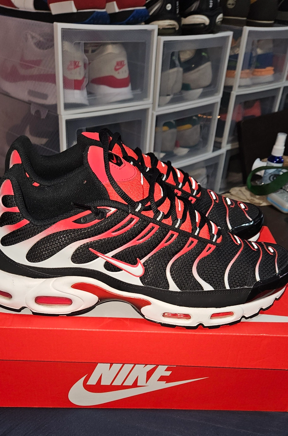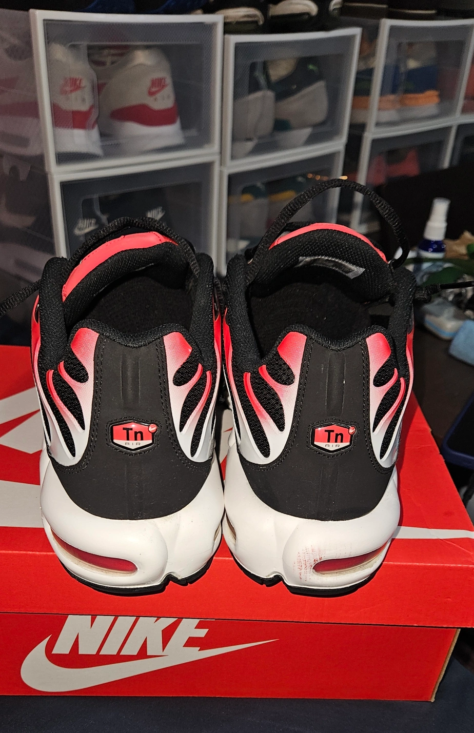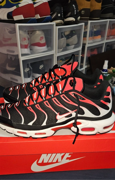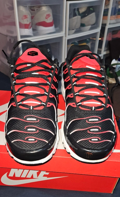 Shoes with black and red color scheme. White soles. Features a mesh design. The Nike swoosh is visible on the side of each shoe. The shoes are comfortable enough to wear all day long, whatever your activities.