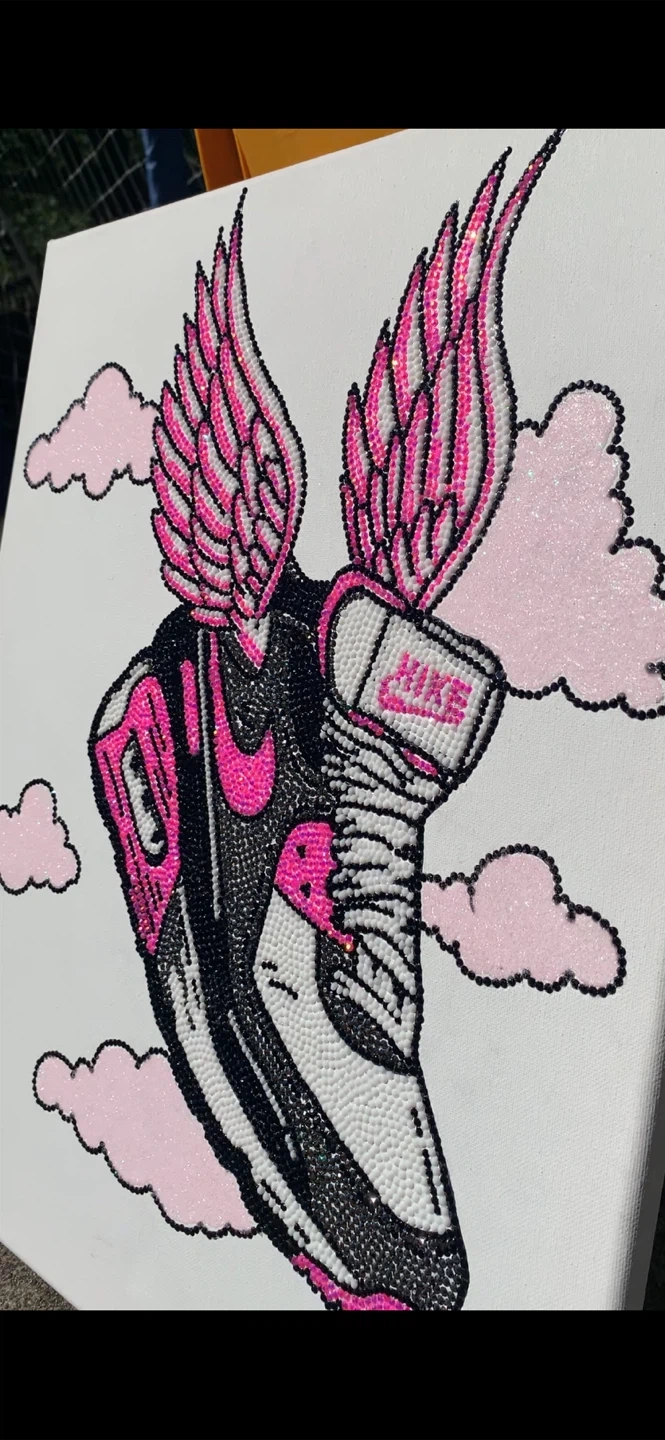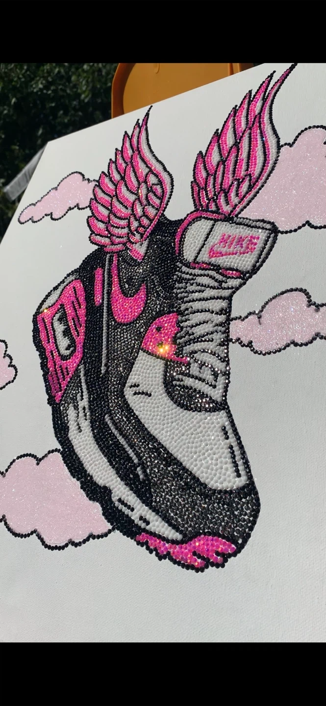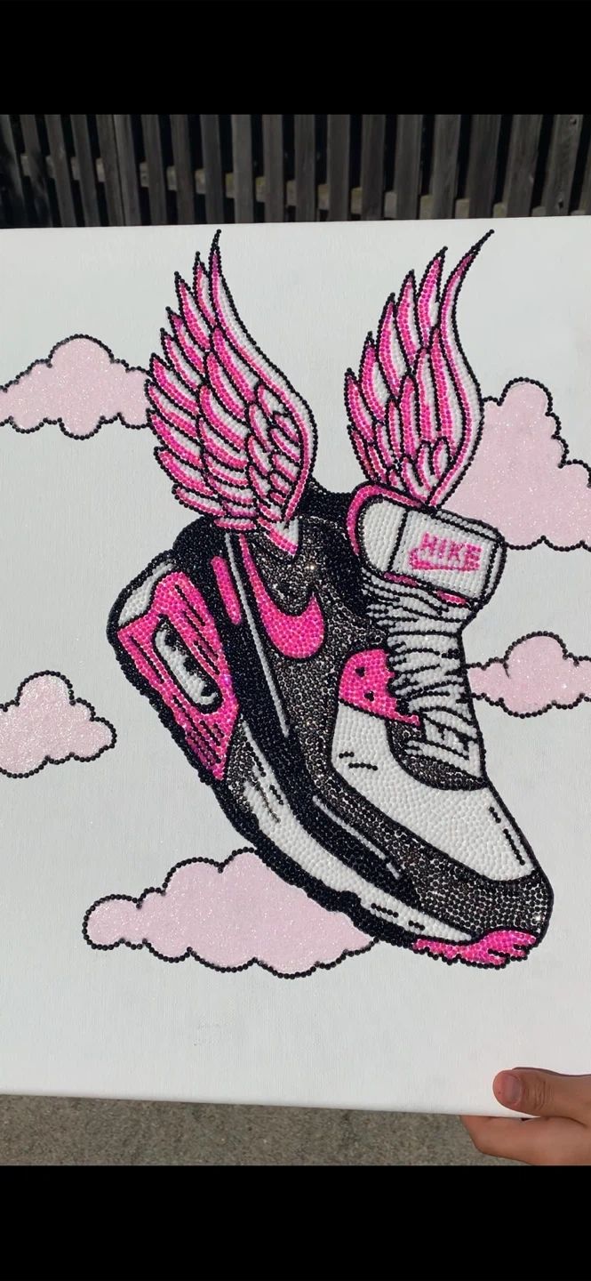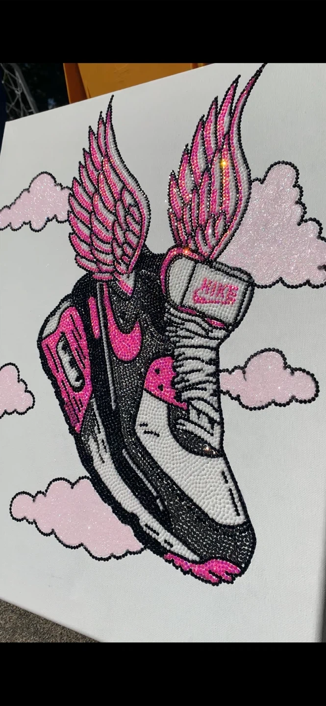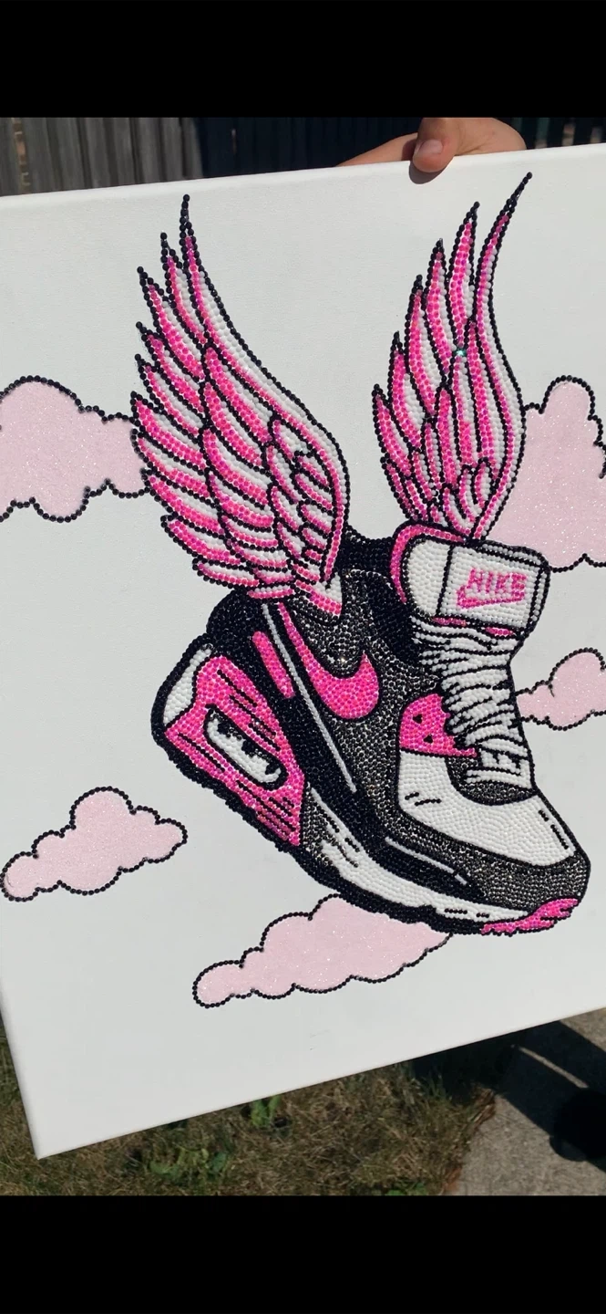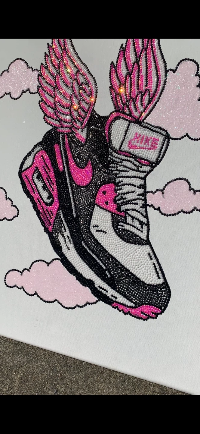 10This is a handmade piece of art depicting a Nike Air Max shoe with wings. It's a unique and eye-catching piece!