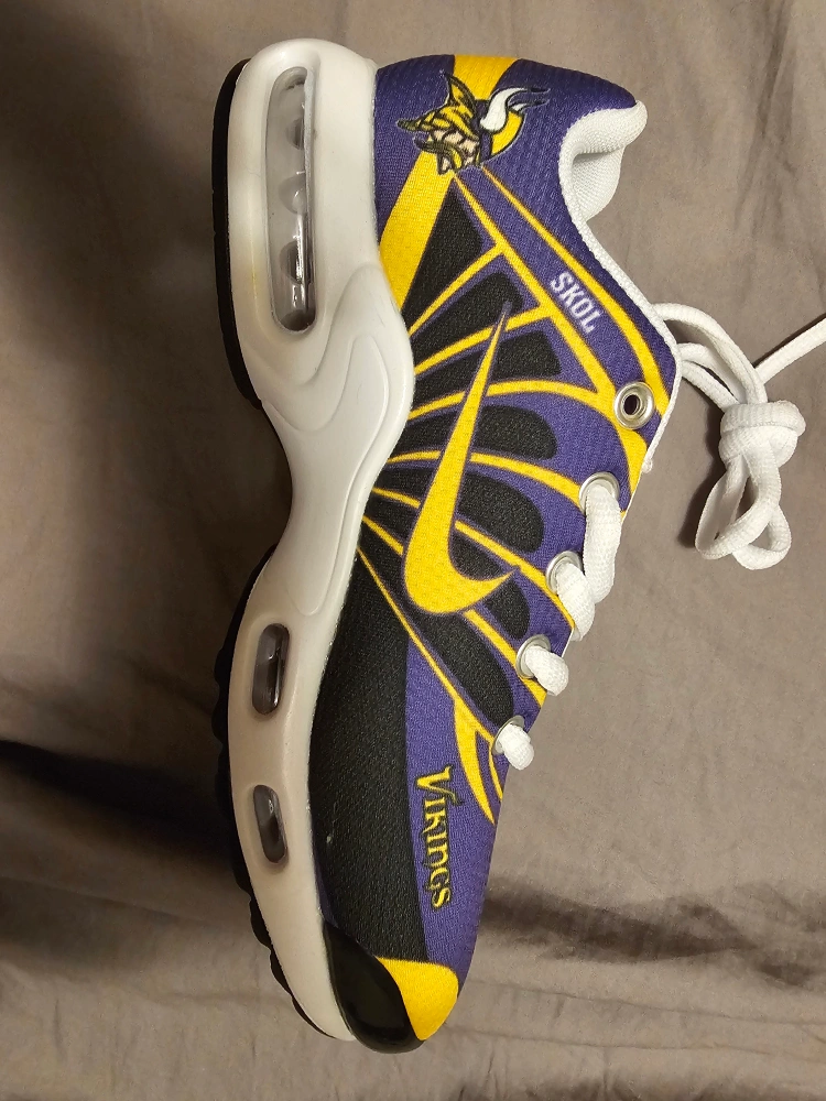 Selling a pair of Nike Air Max TN sneakers in a Vikings edition colorway! The shoes feature the Vikings logo and team colors. They appear to be in good condition and ready for a new home! NEVER WORN.