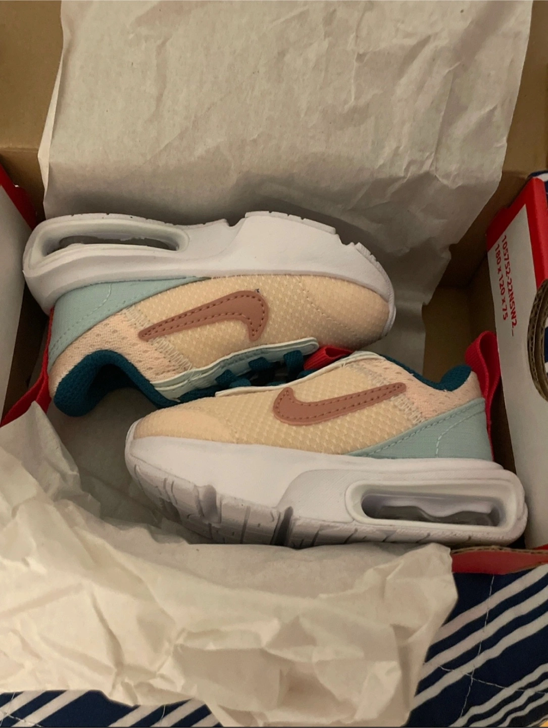 292Nike Air Max Excee shoes for toddlers. They come in a light blue, teal, pink, and white color scheme. The shoes are in a size 4. They come in the original box.