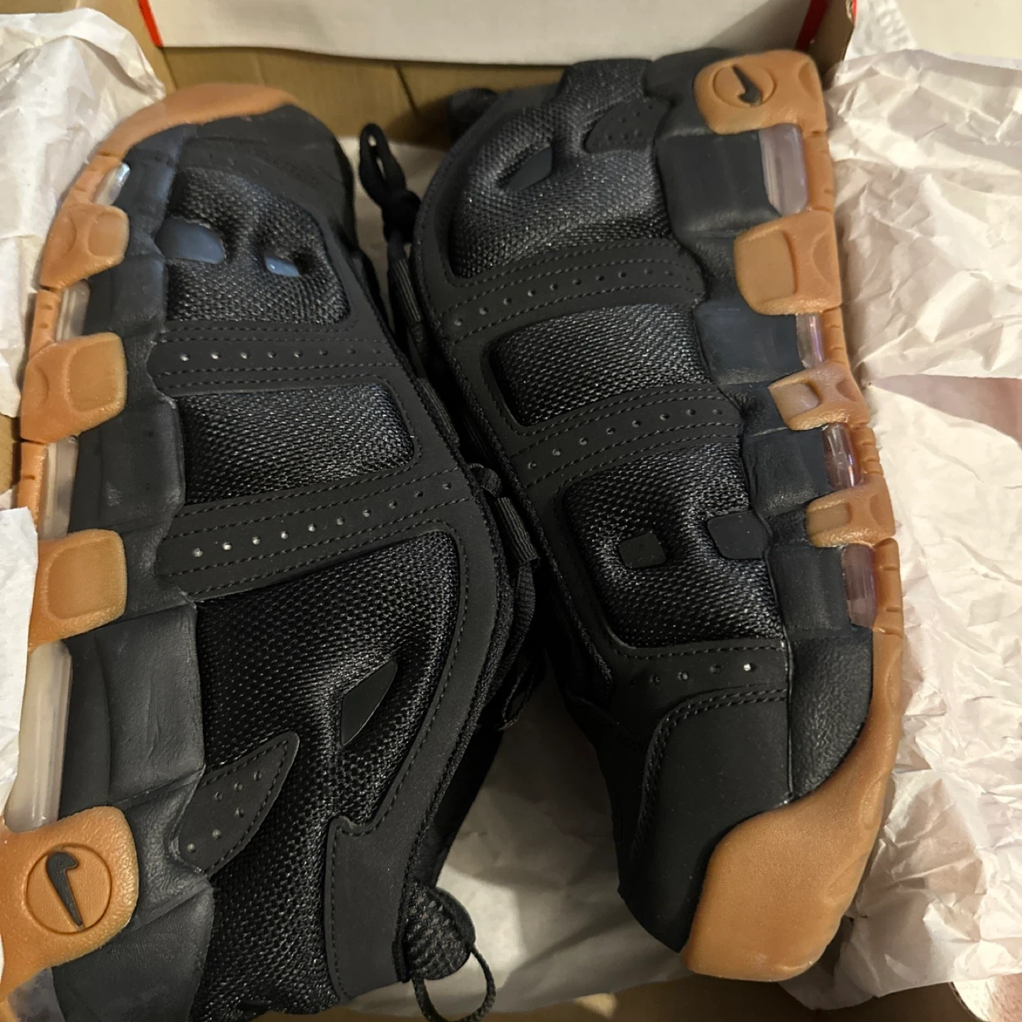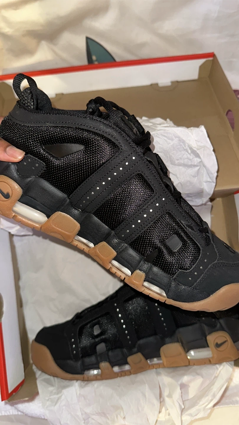 Selling a pair of Nike Air More Uptempo sneakers in black and gum. They come with the original box. These are in great condition and ready for a new home!