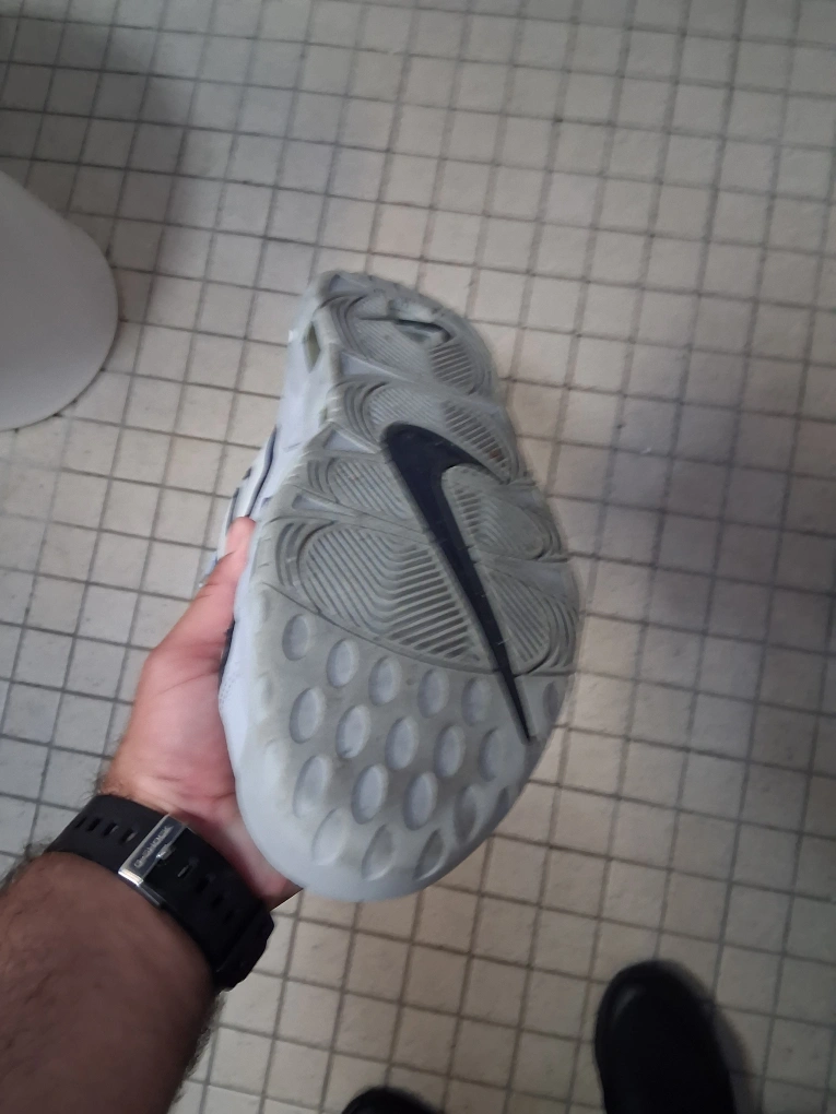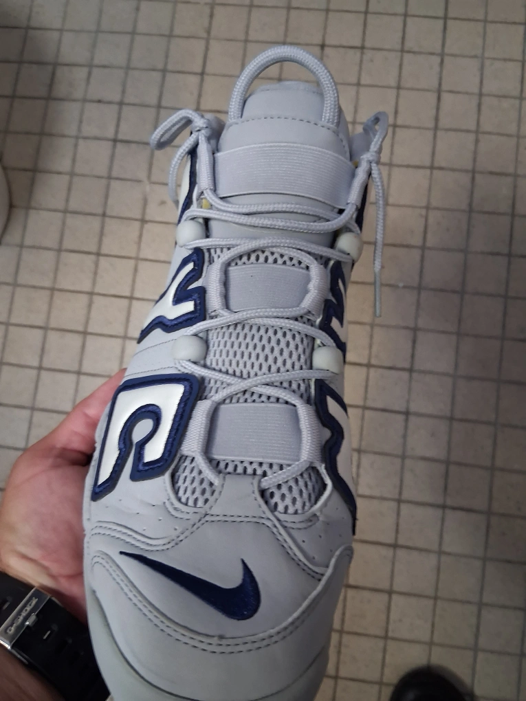 Selling a pair of Nike Air More Uptempo sneakers in a grey and navy colorway. These iconic shoes feature the bold 'AIR' lettering on the sides and the classic Nike swoosh logo. They are in used condition, as shown in the photos. Perfect for adding a retro touch to your style!