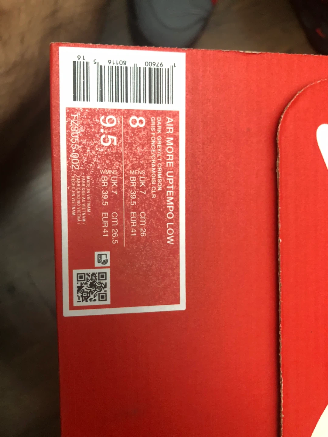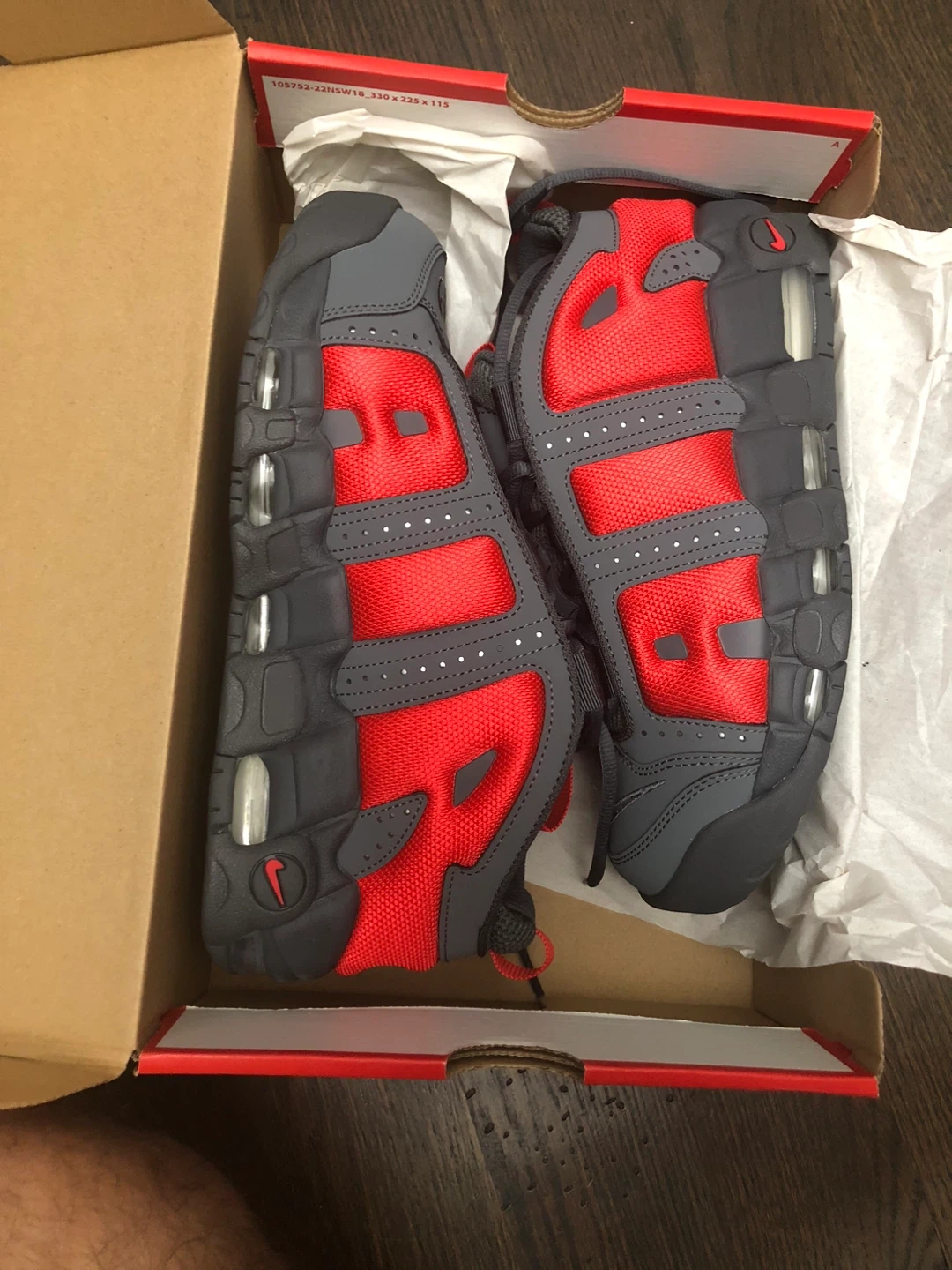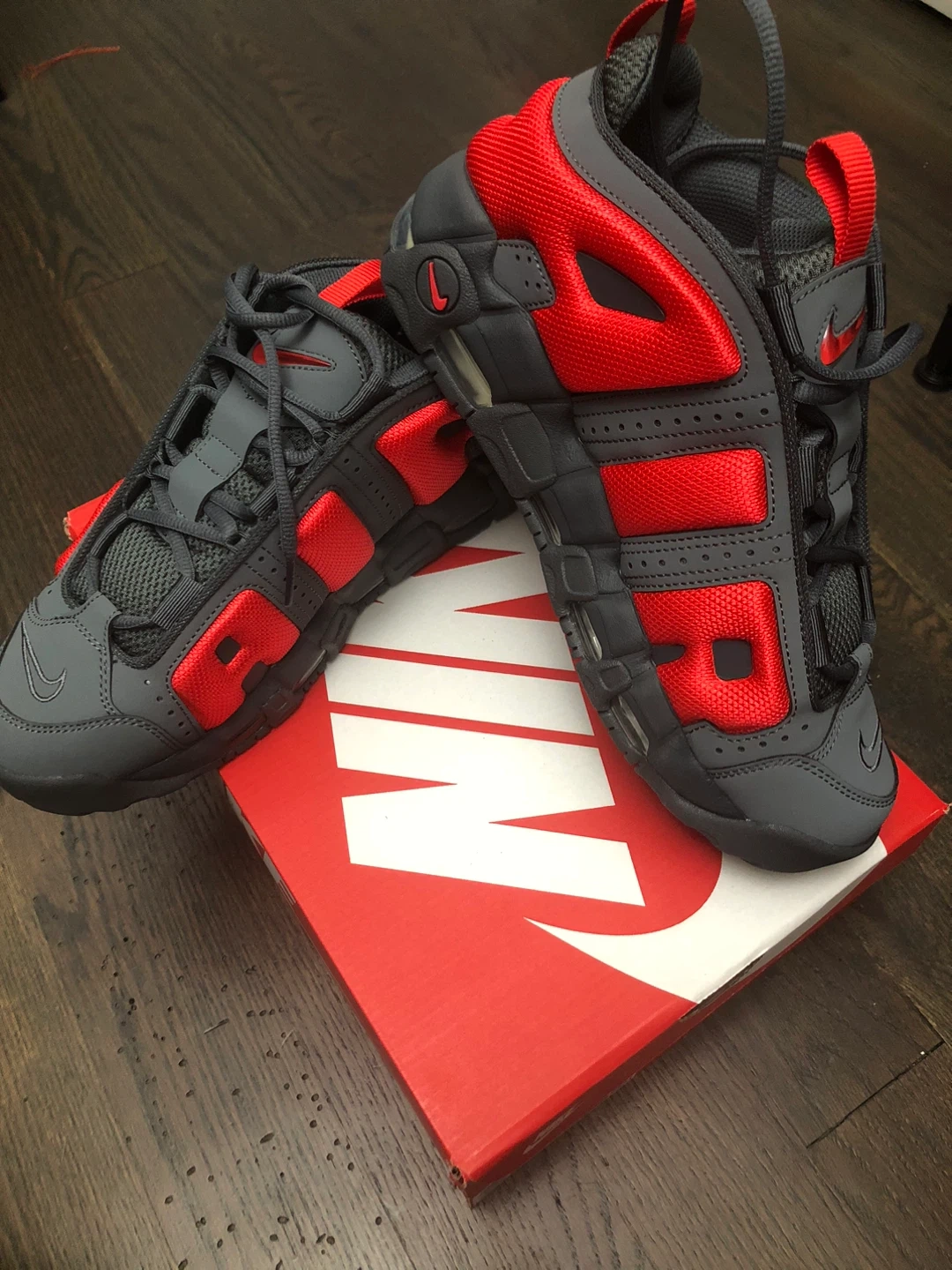 Selling a pair of Nike Air More Uptempo Low sneakers in size 8. The colorway is Dark Grey/Lt Crimson. They come with the original box!