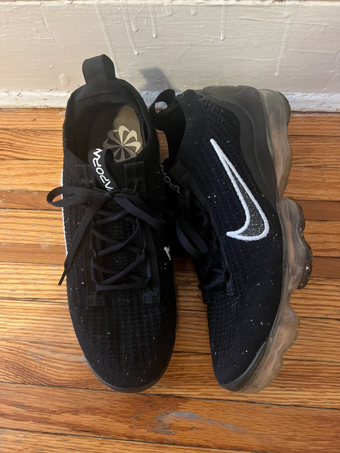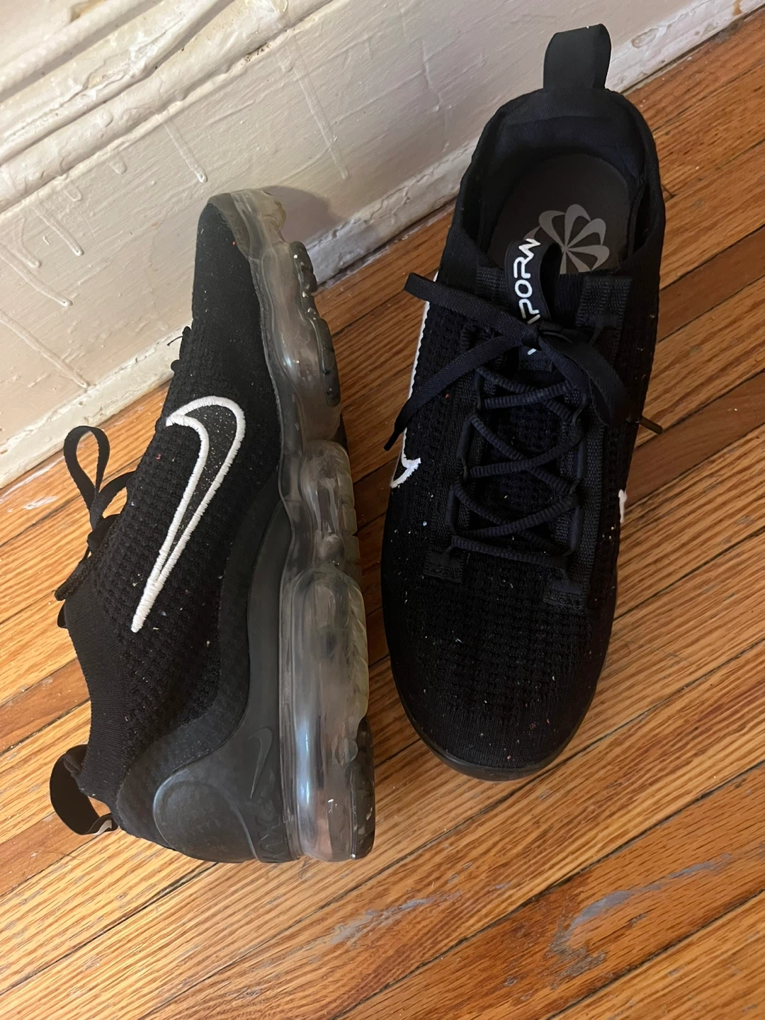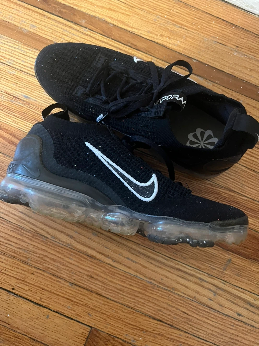 Selling a pair of Nike Air Vapormax 2023 Flyknit shoes in black. They feature the iconic Nike swoosh and a clear, cushioned sole. Great for running or everyday wear!