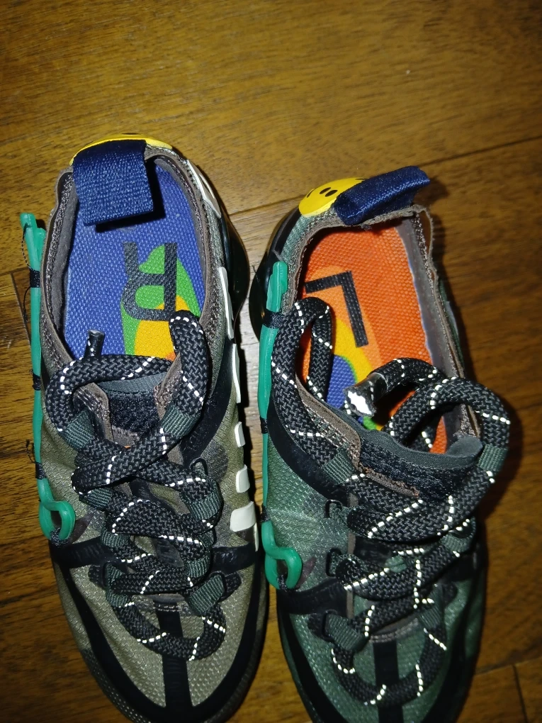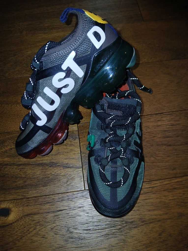 5Nike Air VaporMax 2023 featuring an olive and orange colorway. These stylish and comfortable shoes are perfect for everyday wear. The design includes the word "JUST" on one shoe and ".D" on the other. Check out the photos for more details!