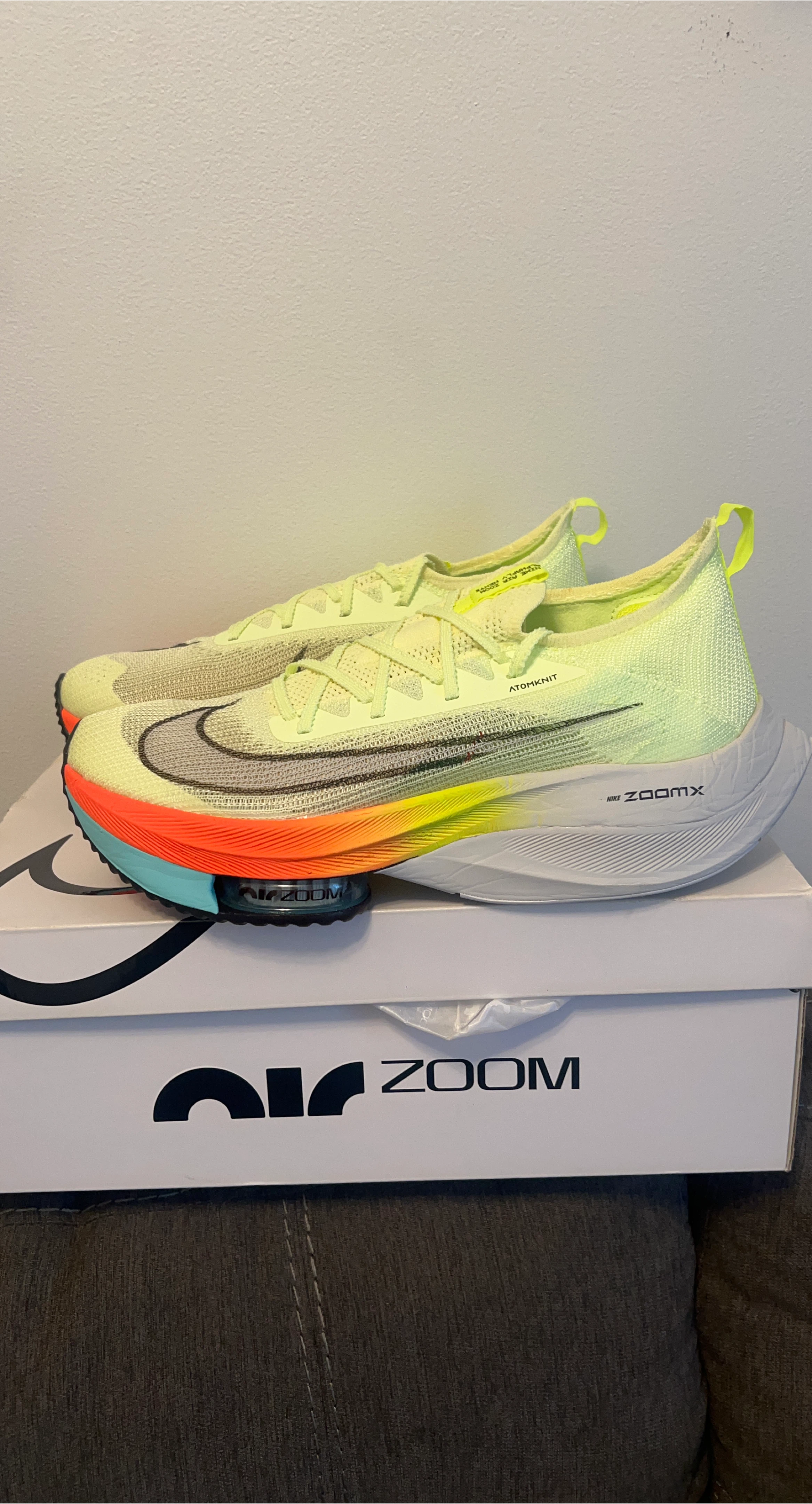Selling a pair of Nike Air Zoom Alphafly NEXT% Flyknit running shoes. They come with the original box. The shoes feature Atomknit technology and Nike ZoomX cushioning for a lightweight and responsive feel
