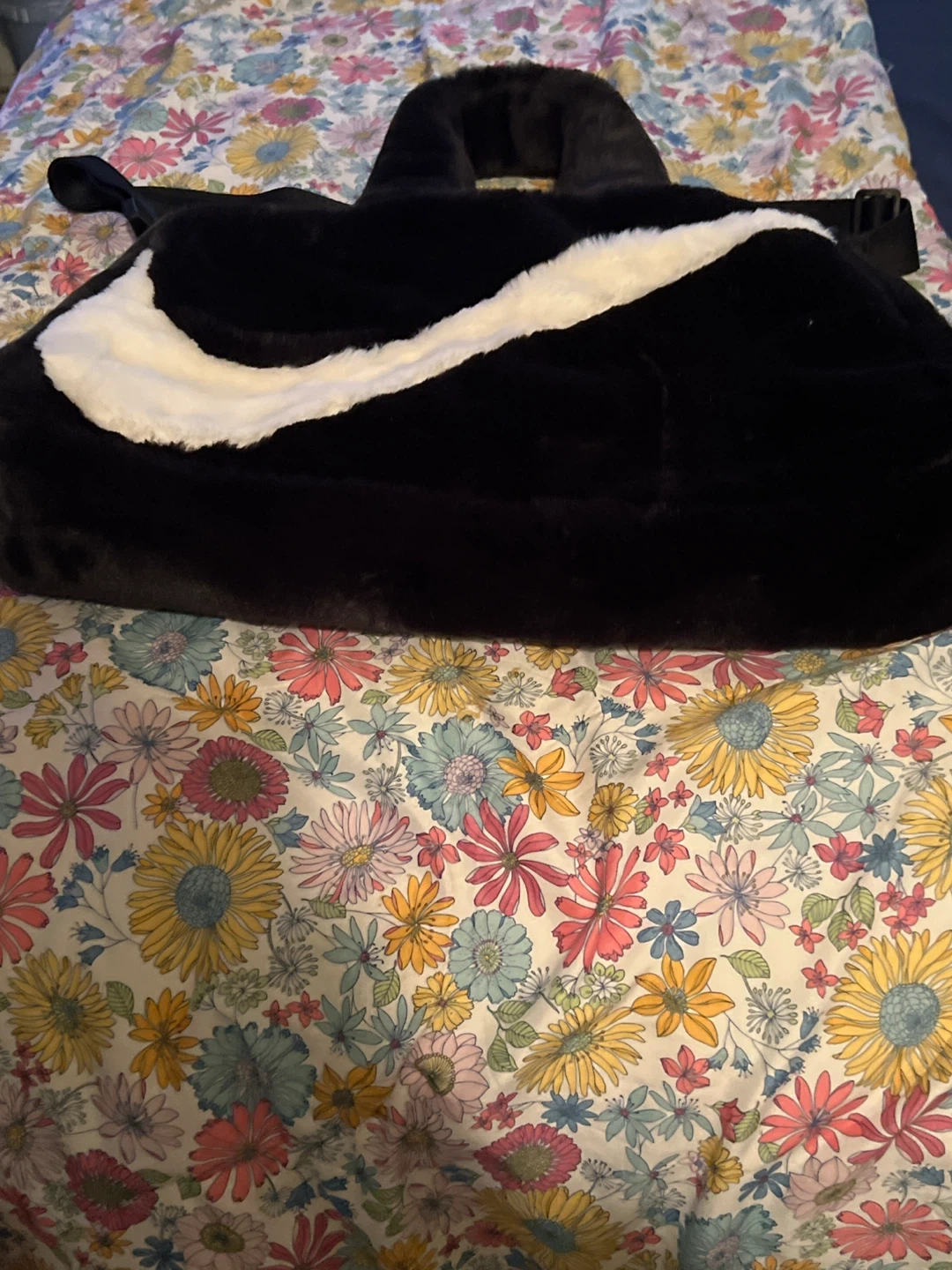38Selling a super cute Nike tote bag! It's made of black faux fur and has the iconic white swoosh logo. Perfect for carrying your essentials in style