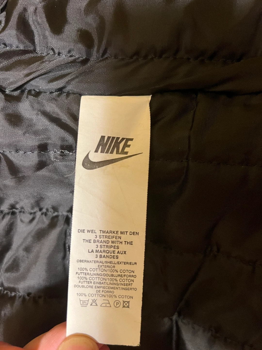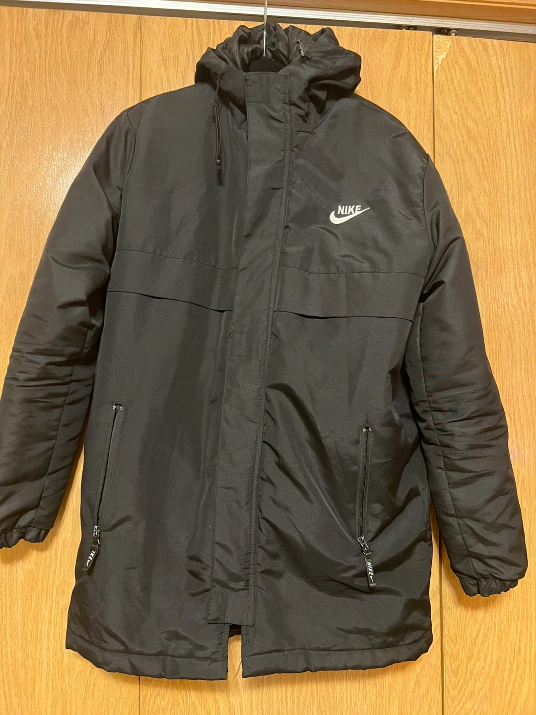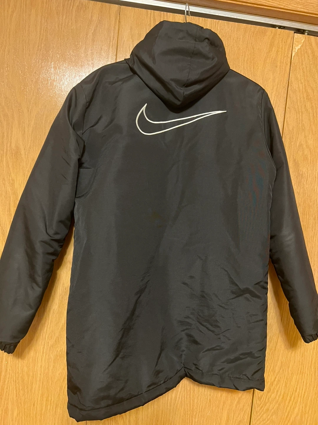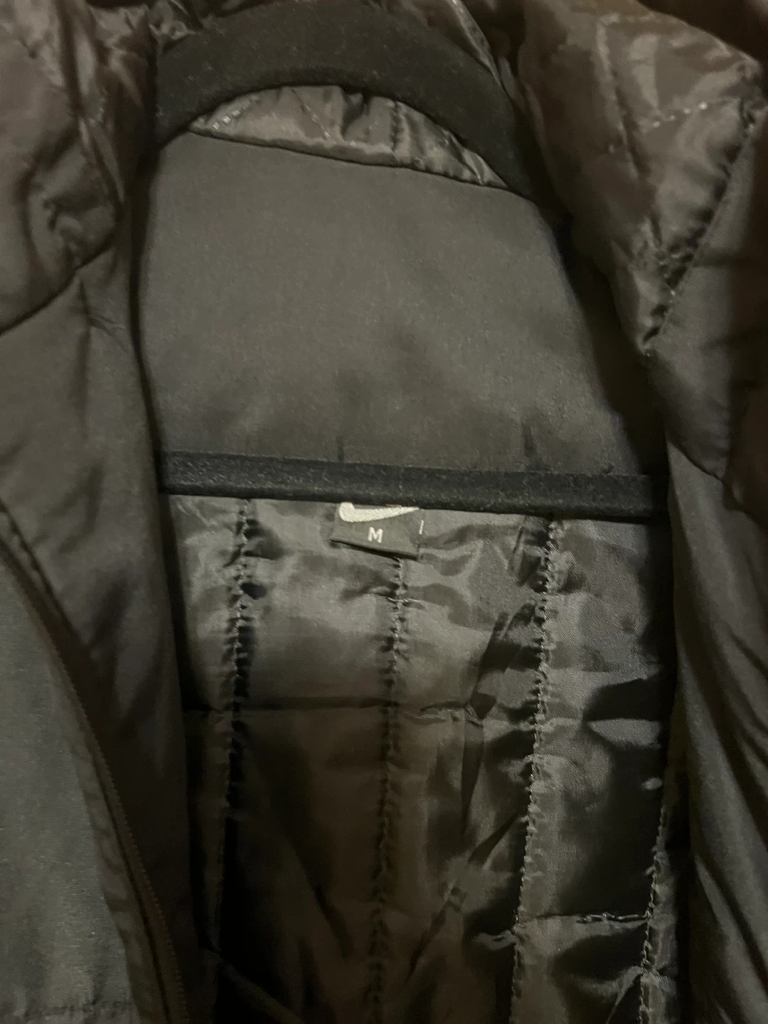 Selling a Nike padded jacket in black! It has a hood and a white Nike logo on the front and back. The size is M.