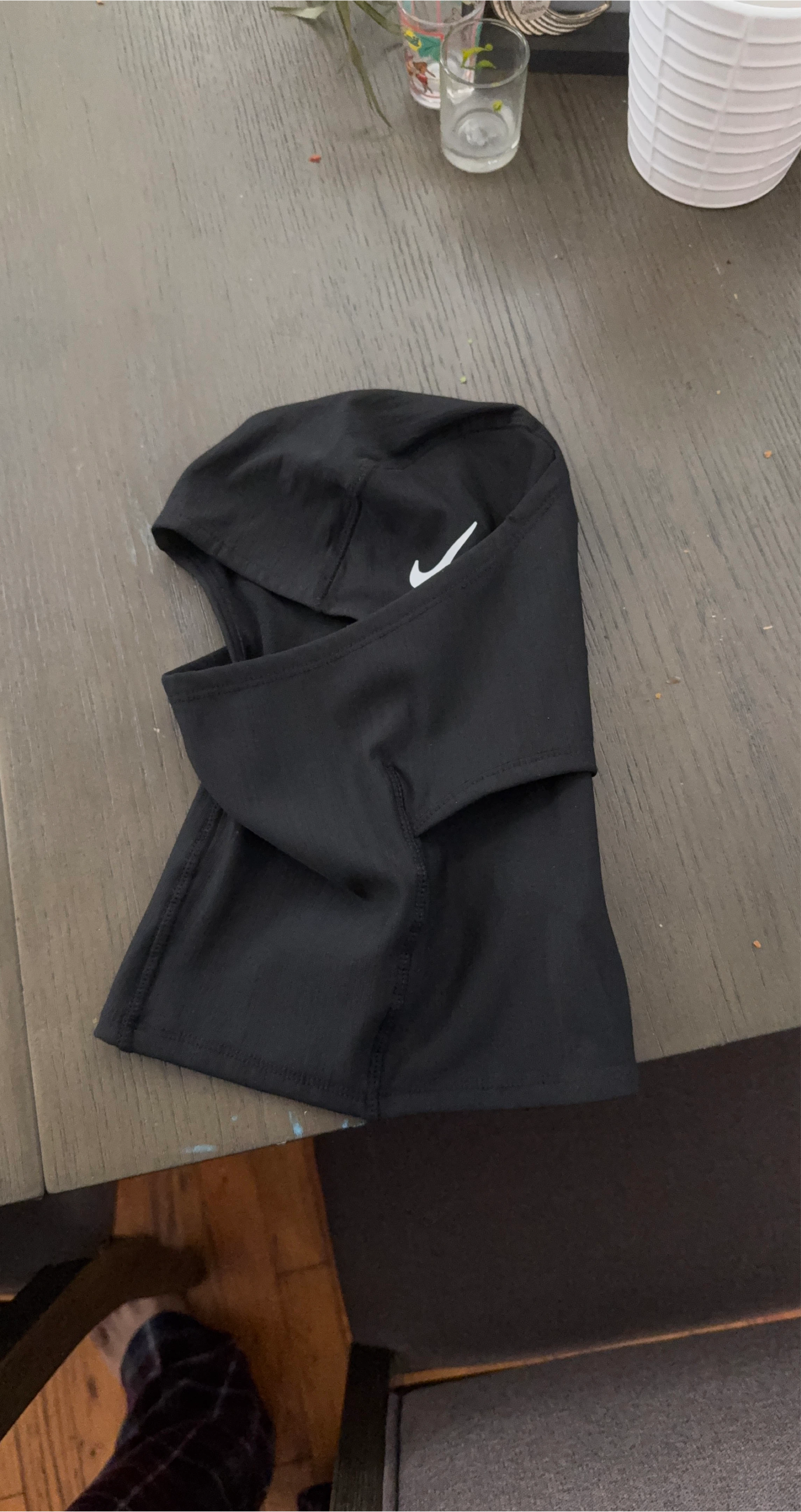 Selling a Nike training balaclava in black. It's perfect for keeping warm during outdoor workouts or activities. Features the iconic Nike swoosh logo!