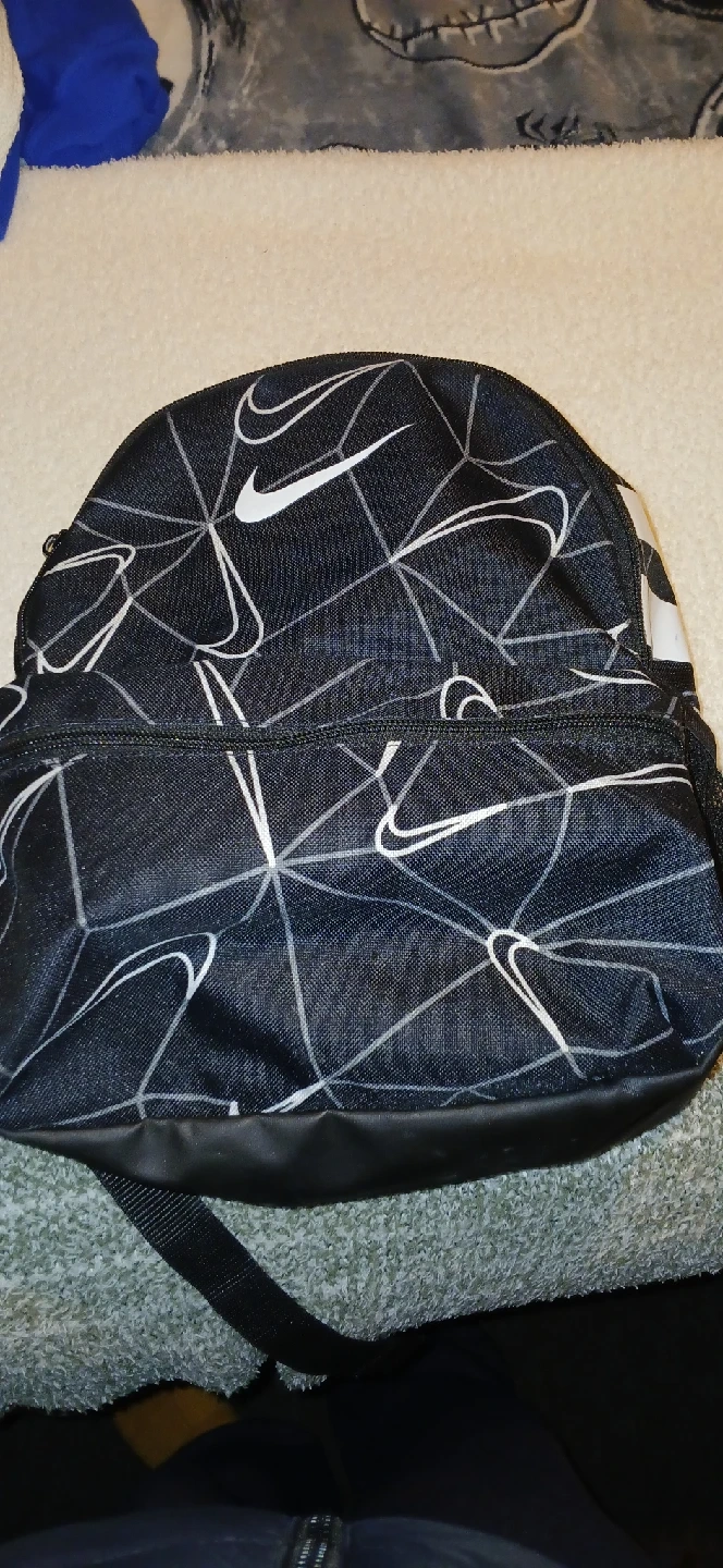 70Selling a Nike backpack with a cool black and white geometric pattern. It's in great condition and features the iconic Nike swoosh. Perfect for carrying your essentials! Perfect for kids