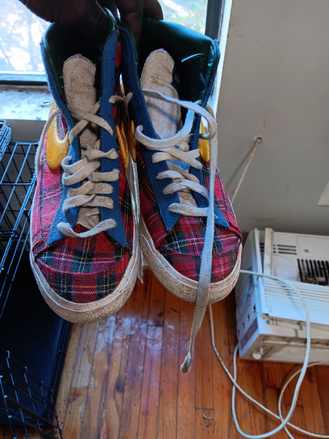 Selling a pair of Nike Blazer Mid '77 "Coming to America" shoes! They feature a unique plaid design with a gold swoosh and "Coming to America" on the heel. These shoes are in used condition, but still have lots of life left!