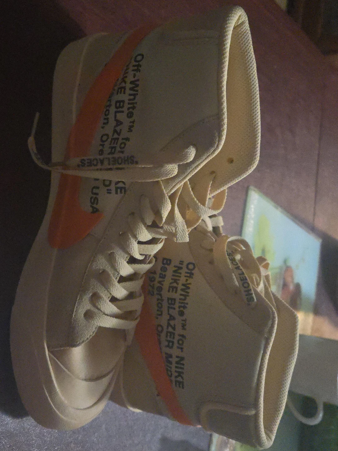 10Selling a pair of Nike Blazer Mid Off-White sneakers. They feature the iconic Off-White design elements. The shoe has the text "SHOELACES" on the laces and the signature Off-White text on the side. Great for collectors or everyday wear!