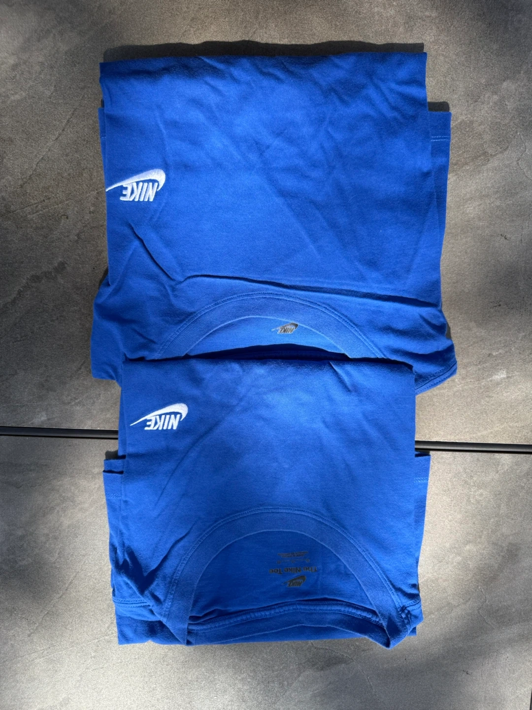 Two blue Nike t-shirts are up for grabs! They feature the classic Nike logo on the upper left side. Perfect for workouts or casual wear!