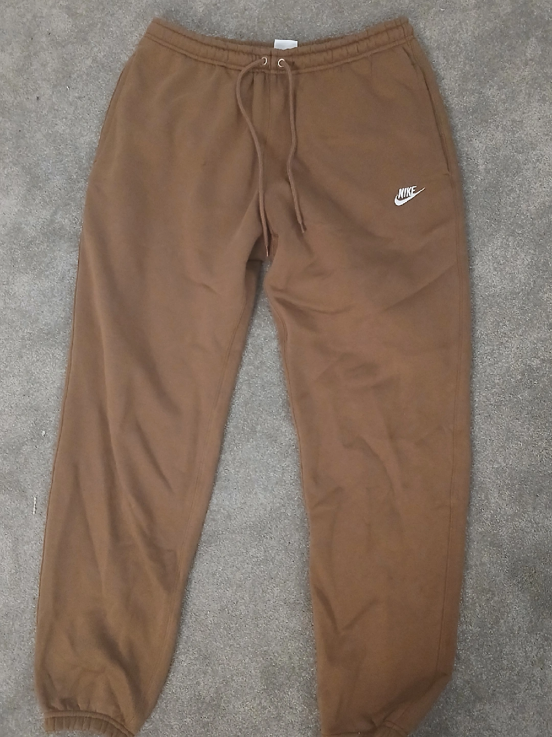Selling a pair of Nike sweatpants in a brown color. They are a size medium and in good condition. Perfect for lounging or working out!
