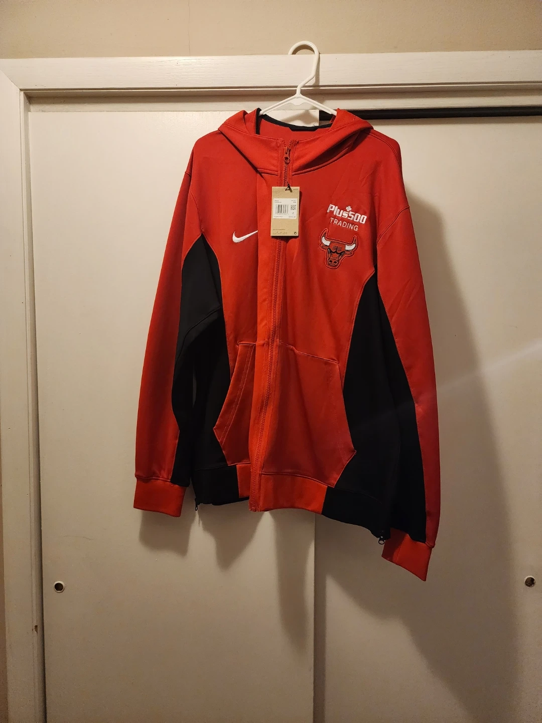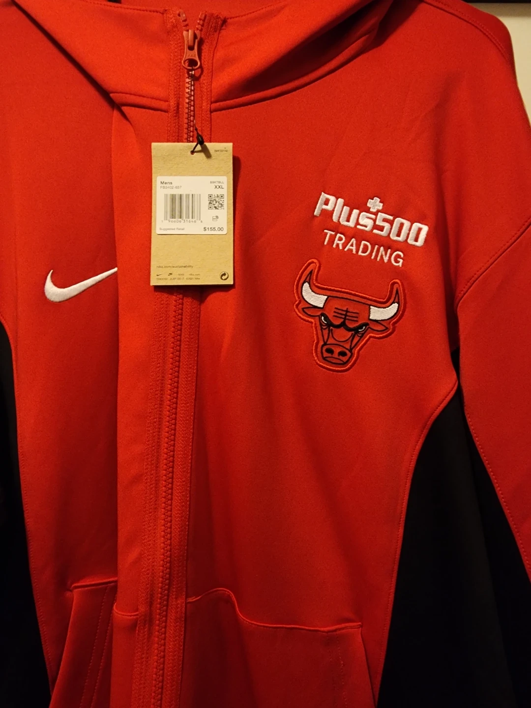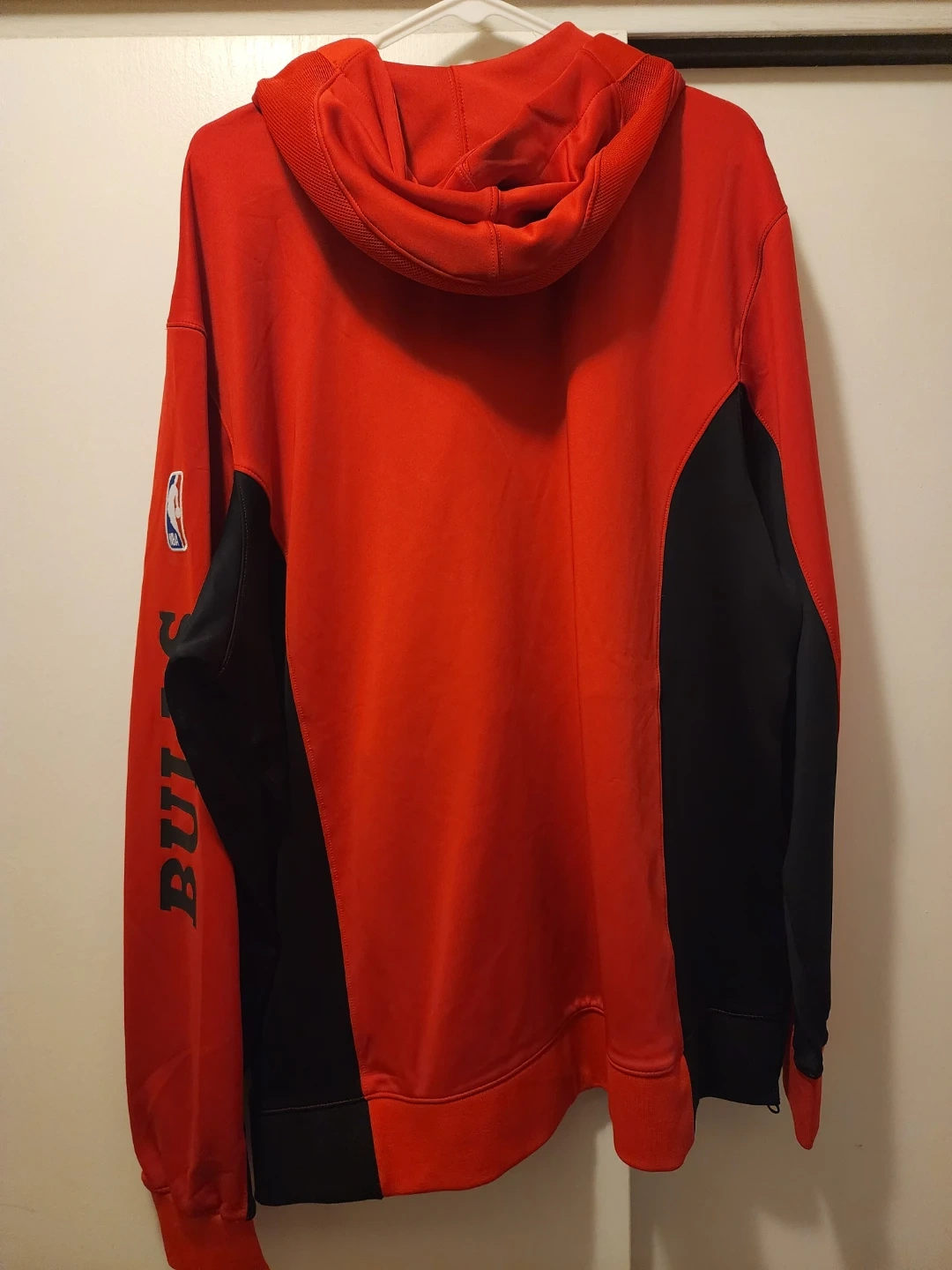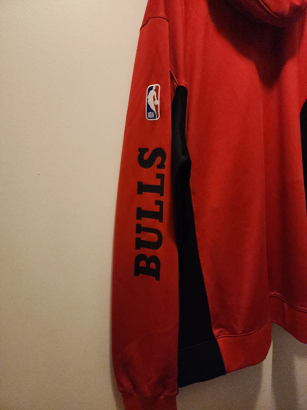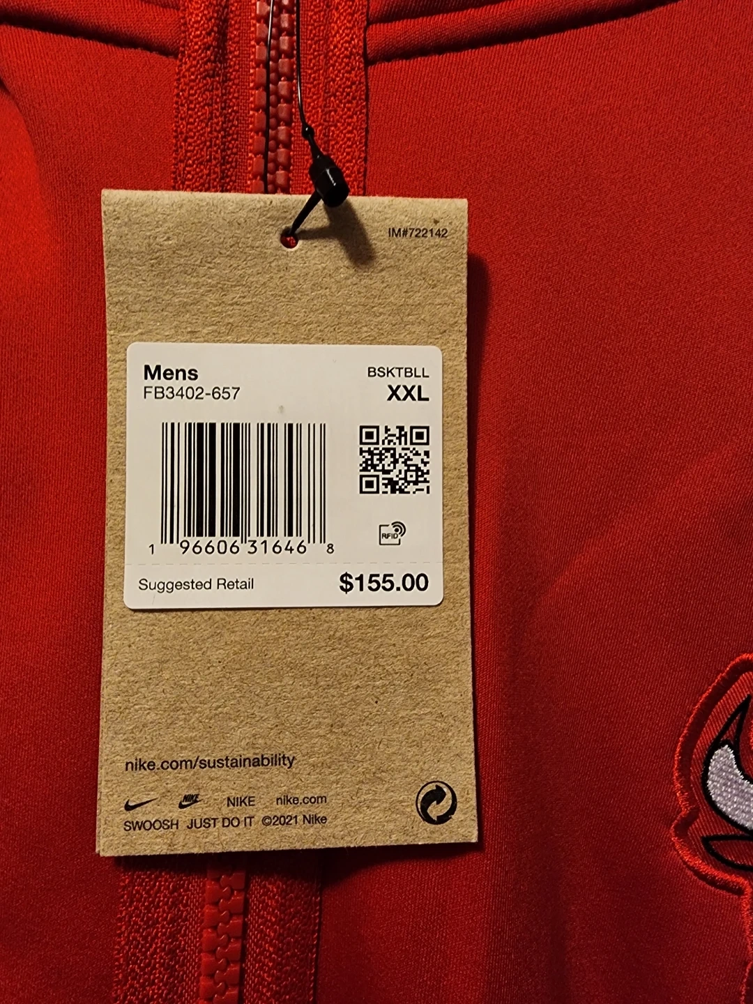 747Get ready to show your team spirit with this Nike Chicago Bulls hoodie! It's a vibrant red and black, featuring the Bulls logo. The size is XXL. The tag shows a suggested retail price of $155