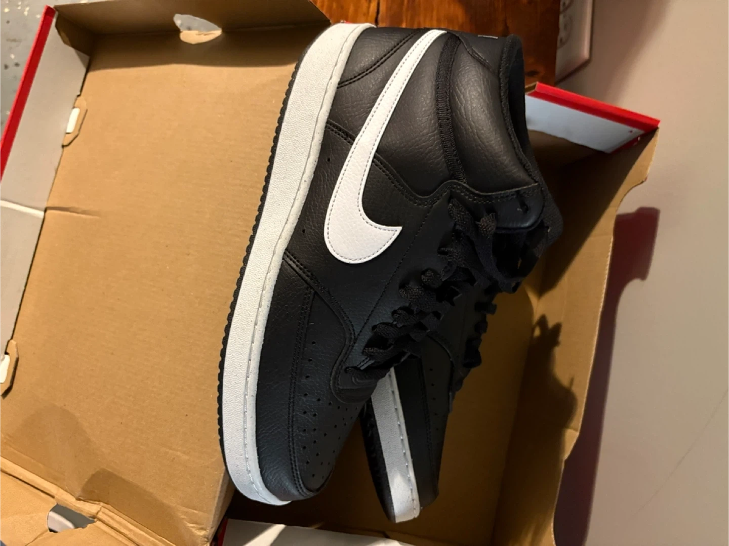 Selling a pair of Nike Court Vision Mid NN sneakers in black and white. They are a US size 10. Comes with the original box!