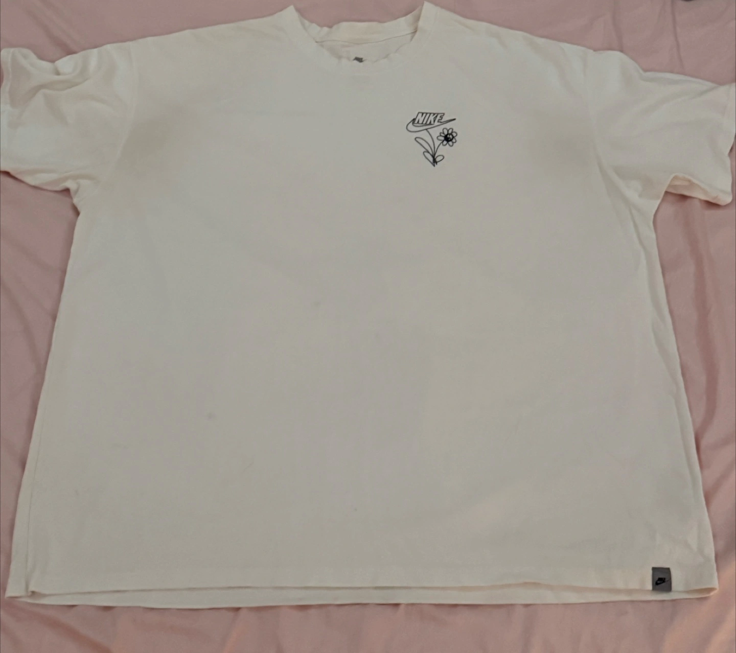 Selling a cream-colored Nike t-shirt with a cute flower design on the front. It's in great condition and ready for a new home!