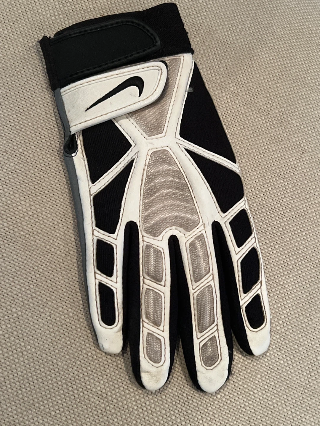 Selling single right hand of Nike youth football receiver glove. There is a logo of an antler on the wrist band and a Y.L. tag inside the glove. Product Name: Nike D-Tack 6.0 Lineman Gloves Size: Youth Large (YL) Color: Black and White Condition: Describe the condition accurately (e.g., "Gently used," "New with tags," "Excellent condition with minor wear"). Key Features: Padded back of hand for protection. Sticky Magnigrip palms for grip. Adjustable wrist strap for a secure fit. Ventilation on the back of the hand. Intended Use: Football lineman gloves. Or best offer