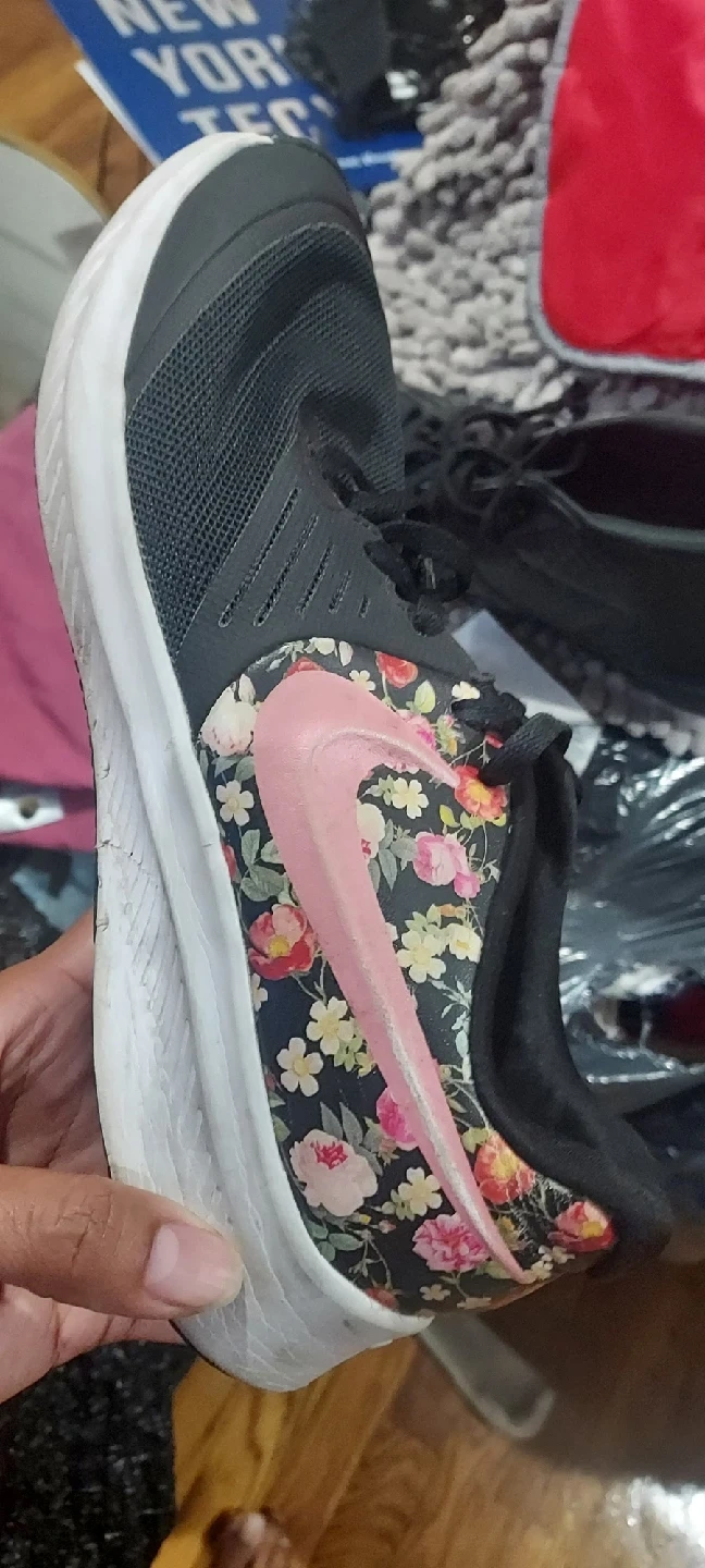 10Selling a pair of Nike Downshifter sneakers with a fun floral design! They feature a pink swoosh and a black mesh upper. The soles show some wear, but they're still in good condition for running or everyday wear