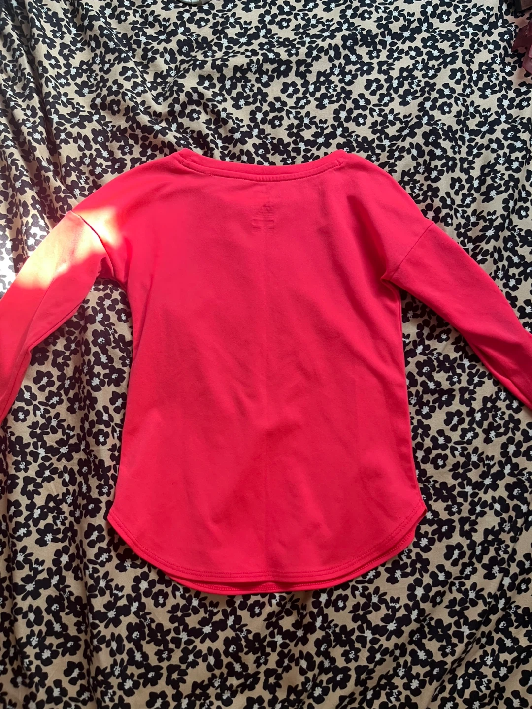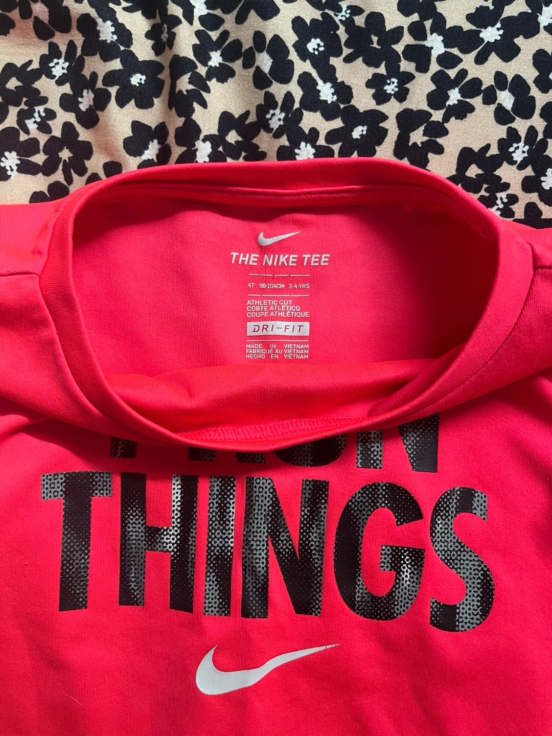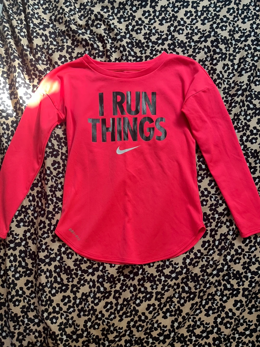Selling a Nike Dri-FIT long-sleeve tee in size 4T. It's a bright pink color with 'I RUN THINGS' printed on the front. The tee is made of Dri-FIT material, which is great for keeping kids cool and comfortable while they play