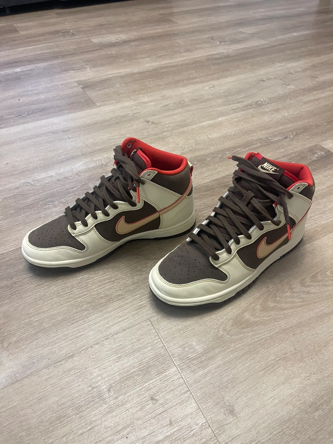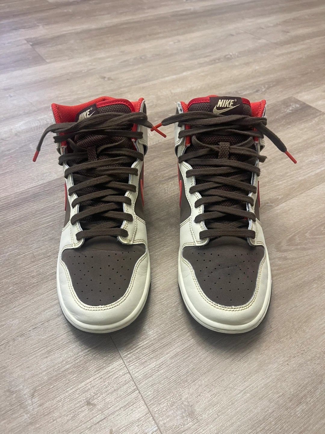 76Selling a pair of Nike Dunk High Premium sneakers in a chocolate colorway. These high-tops are in good condition and ready for a new home! They feature a mix of brown and off-white leather, with red accents on the lining and laces. A stylish addition to any sneaker collection.