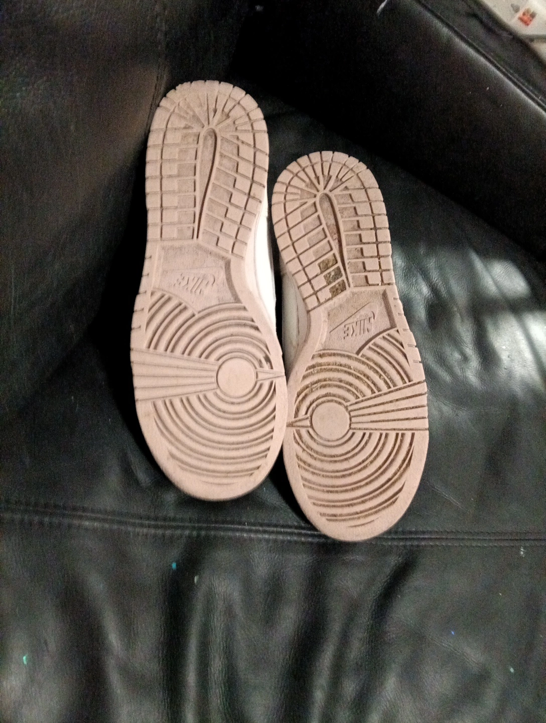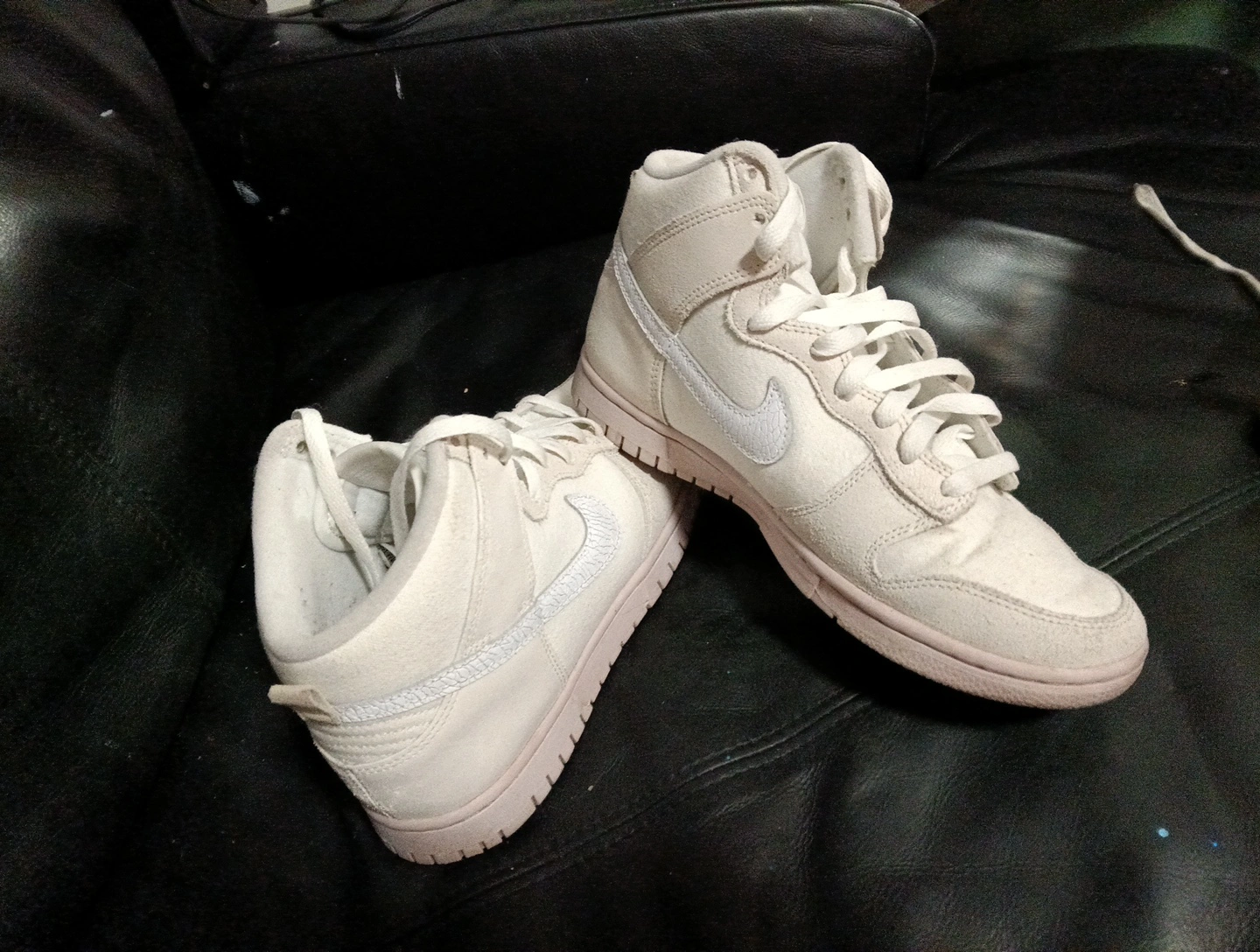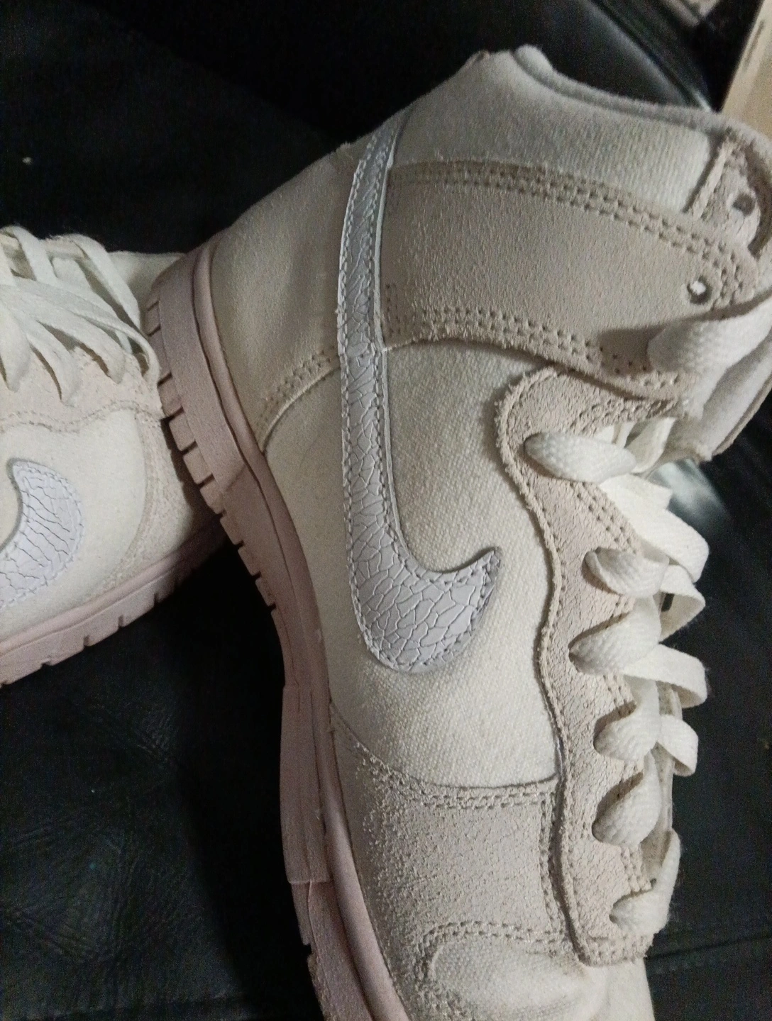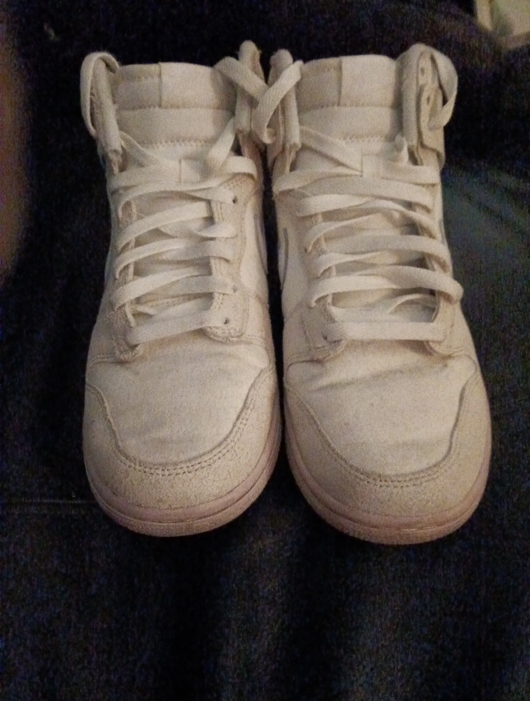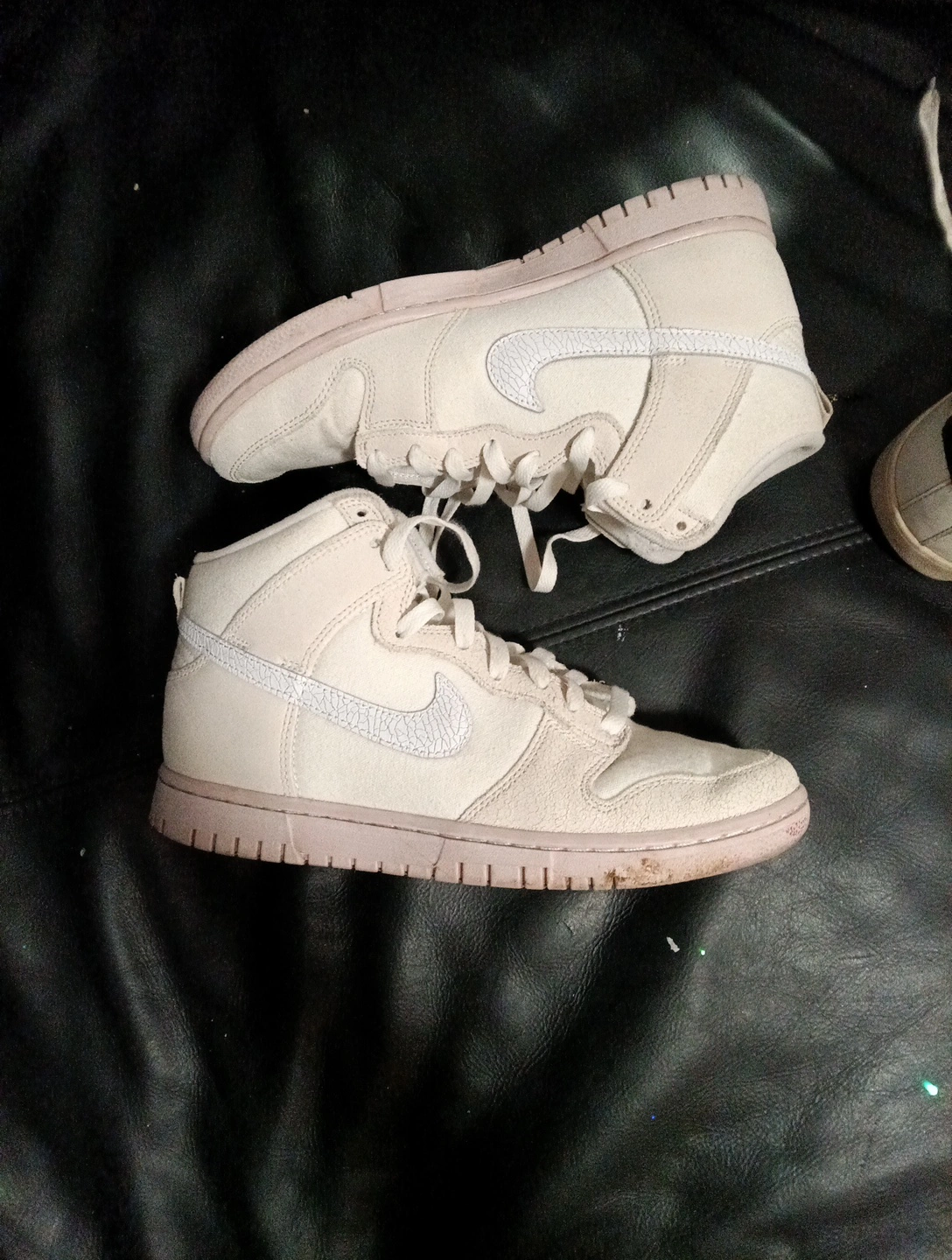 Selling a pair of Nike Dunk High Top sneakers. They're off-white and in used condition but still have lots of life left!