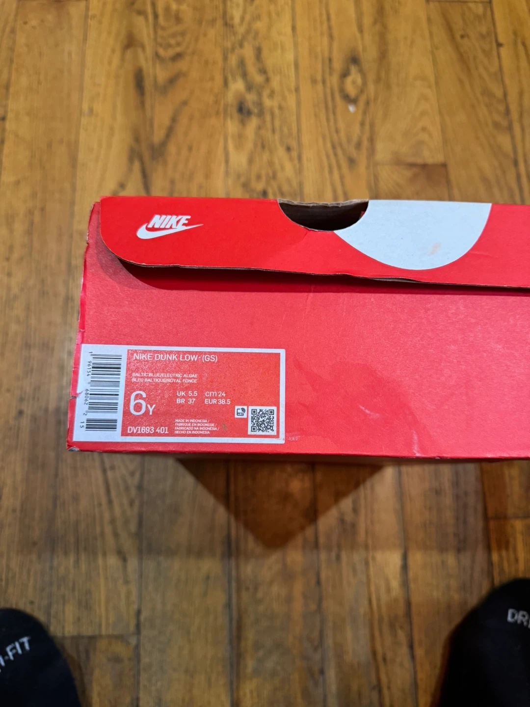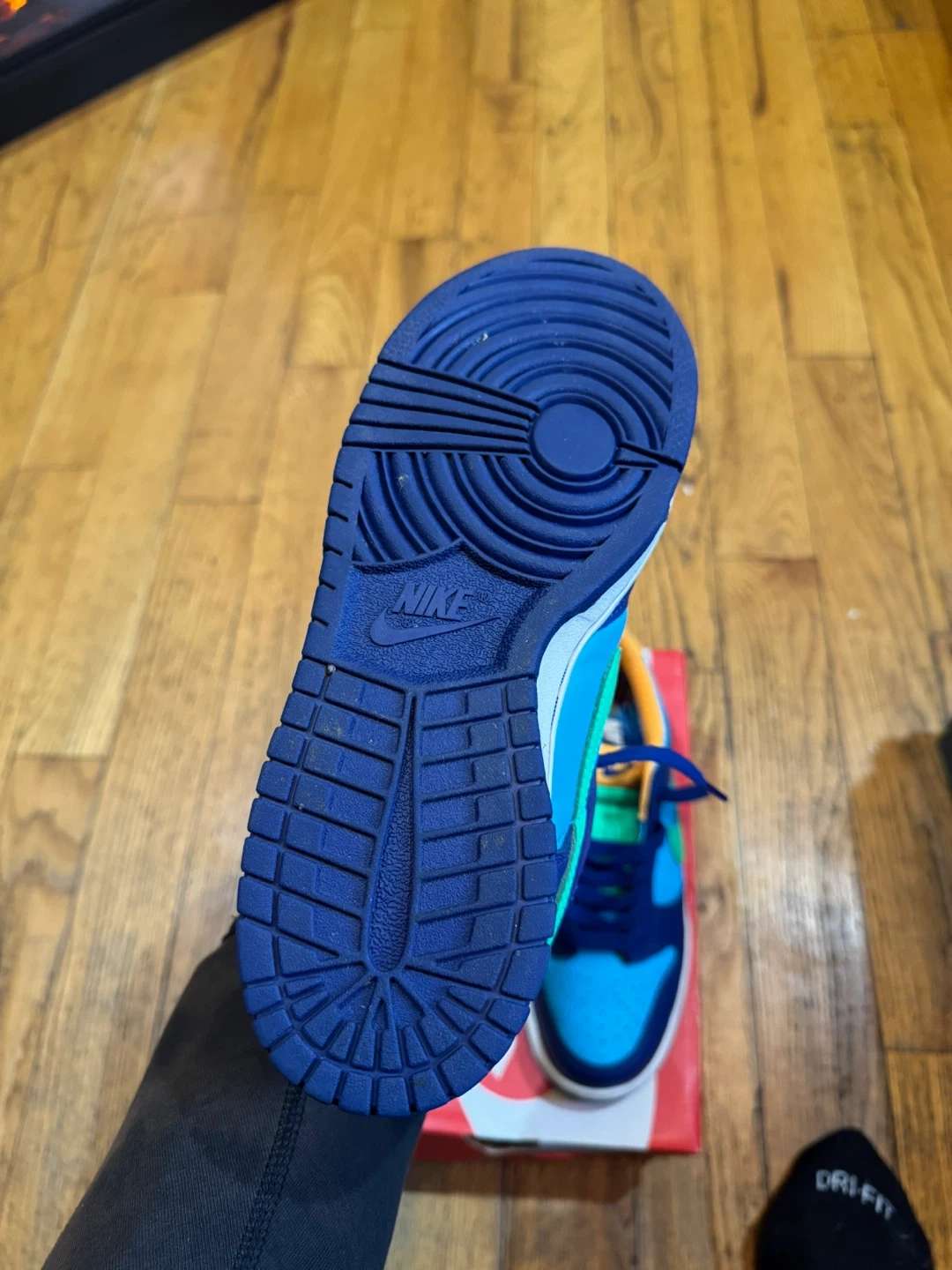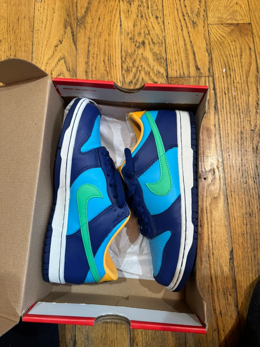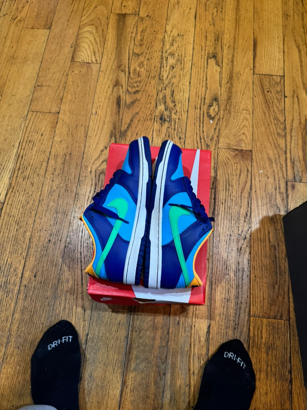 15Selling a pair of Nike Dunk Low (GS) in a cool blue and electric algae colorway! These are a size 6Y for boys. They come with the original box. Perfect for a stylish kid! Just tried on.